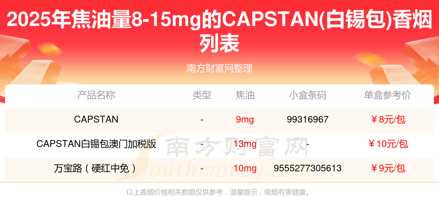 CAPSTAN(白錫包)香煙焦油量8-15mg的煙有哪些?擇煙網(wǎng)為大家整理提供,分別有:CAPSTAN、CAPSTAN白錫包澳門(mén)加稅版、萬(wàn)寶路(硬紅中免)等,具體價(jià)格如下:
