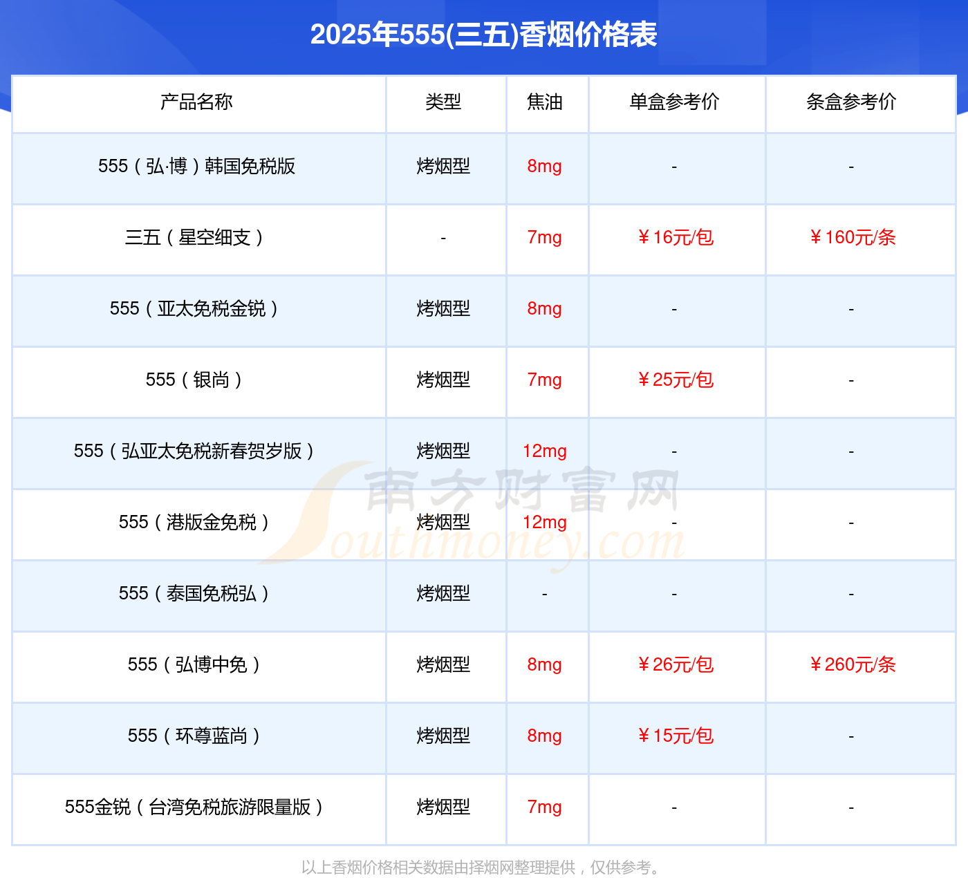 555(三五)香煙創(chuàng)牌于1895年,是英美煙草公司出品的著名品牌,國內(nèi)煙民熟悉的有555金(三五金)、555弘博(三五弘博)、555環(huán)尊(三五環(huán)尊)、555藍尚(三五藍尚)、555國際(三五國際)等品種和系列,555(三五)香煙是國外香煙品牌中為數(shù)不多的烤煙之一,老三五這個名字為國內(nèi)不少煙民所津津樂道。