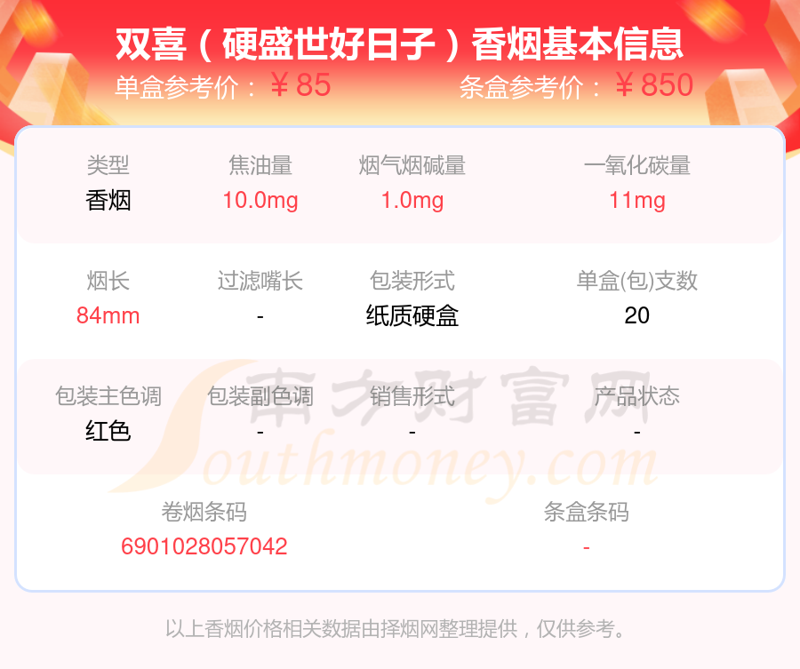 雙喜(硬盛世好日子)單盒參考價(jià):85元