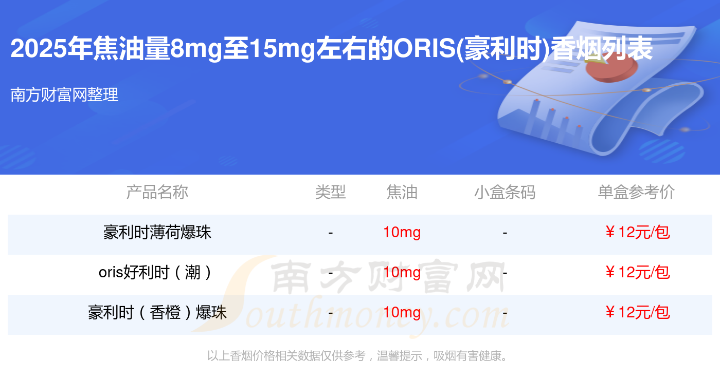 擇煙網(wǎng)為大家盤(pán)點(diǎn)了ORIS(豪利時(shí))香煙焦油量8mg至15mg左右的,分別有豪利時(shí)薄荷爆珠、oris好利時(shí)(潮)、豪利時(shí)(香橙)爆珠等,具體價(jià)格如下:
