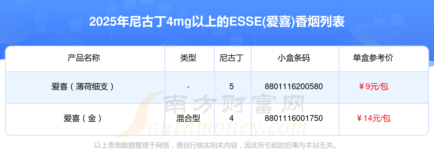 ESSE(愛喜)香煙尼古丁4mg以上的煙有愛喜(薄荷細支)、愛喜(金)等,詳細價格如下: