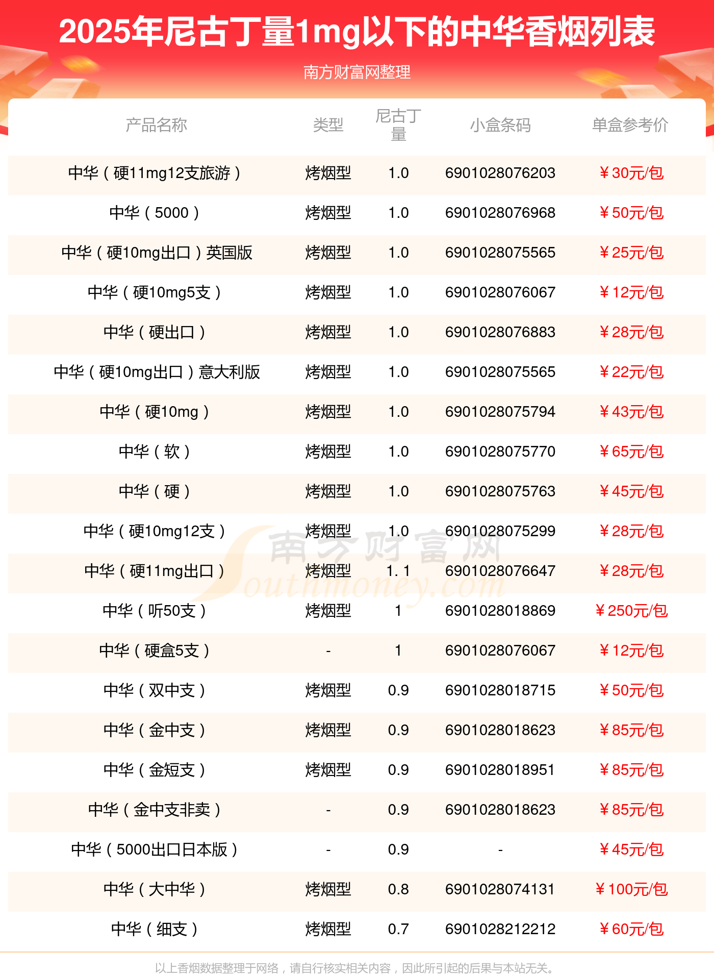 中華香煙尼古丁量1mg以下的煙分別有中華(硬11mg12支旅游)參考價30.0元/包、中華(5000)參考價50.0元/包、中華(硬10mg出口)英國版參考價25.0元/包、中華(硬10mg5支)參考價12.0元/包、中華(硬出口)參考價28.0元/包、中華(硬10mg出口)意大利版參考價22.0元/包、中華(硬10mg)參考價43.0元/包、中華(軟)參考價65.0元/包、中華(硬)參考價45.0元/包、中華(硬10mg12支)參考價28.0元/包等。