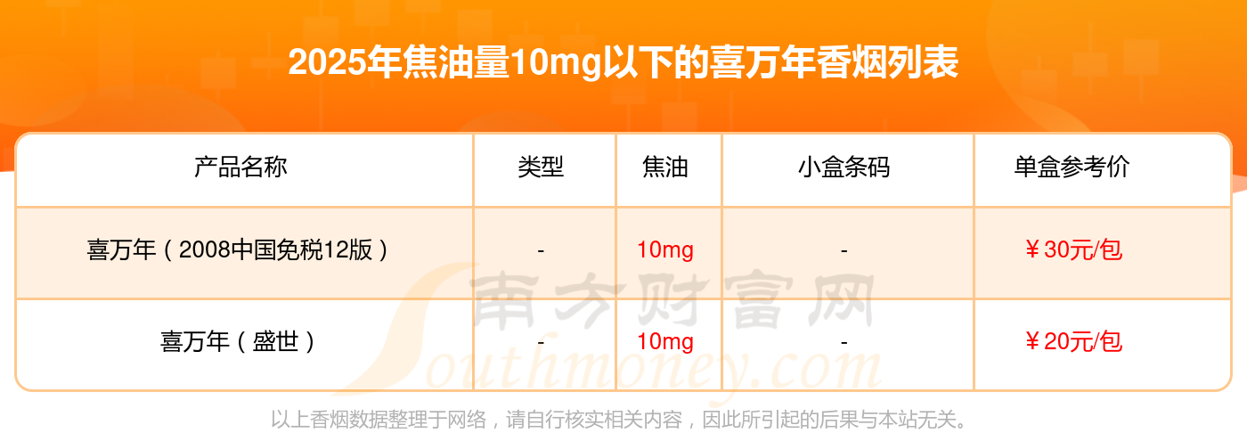 喜萬(wàn)年香煙焦油量10mg以下的煙有喜萬(wàn)年(2008中國(guó)免稅12版)、喜萬(wàn)年(盛世)等,具體價(jià)格如下: