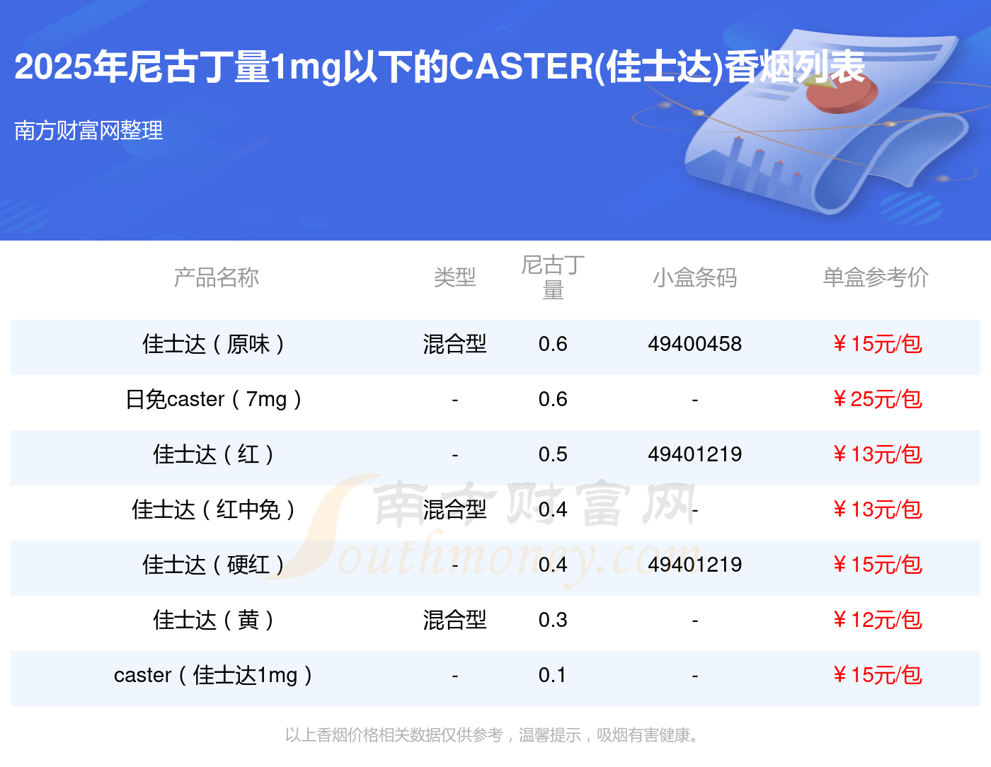 擇煙網(wǎng)為大家盤點了CASTER(佳士達(dá))香煙尼古丁量1mg以下的,分別有佳士達(dá)(原味)、日免caster(7mg)、佳士達(dá)(紅)、佳士達(dá)(紅中免)、佳士達(dá)(硬紅)、佳士達(dá)(黃)、caster(佳士達(dá)1mg)等,具體價格如下: