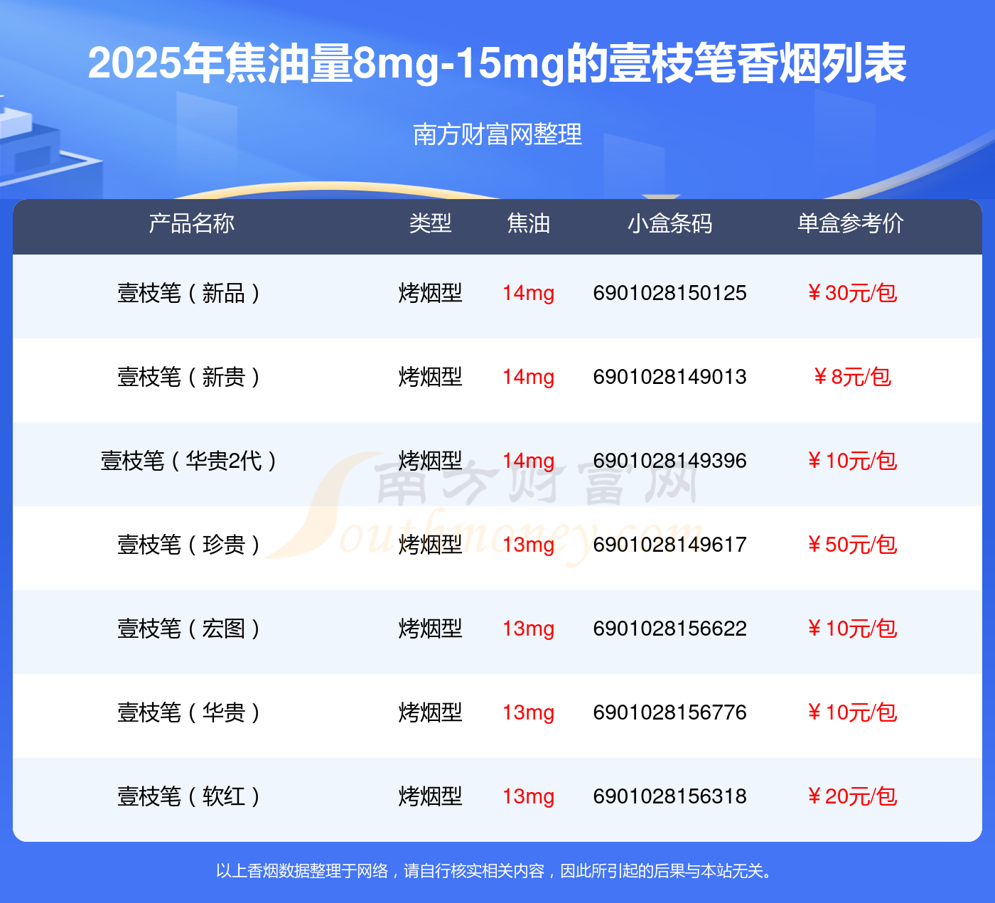 擇煙網(wǎng)為大家盤點(diǎn)了焦油量8mg-15mg的壹枝筆香煙,有以下這些: