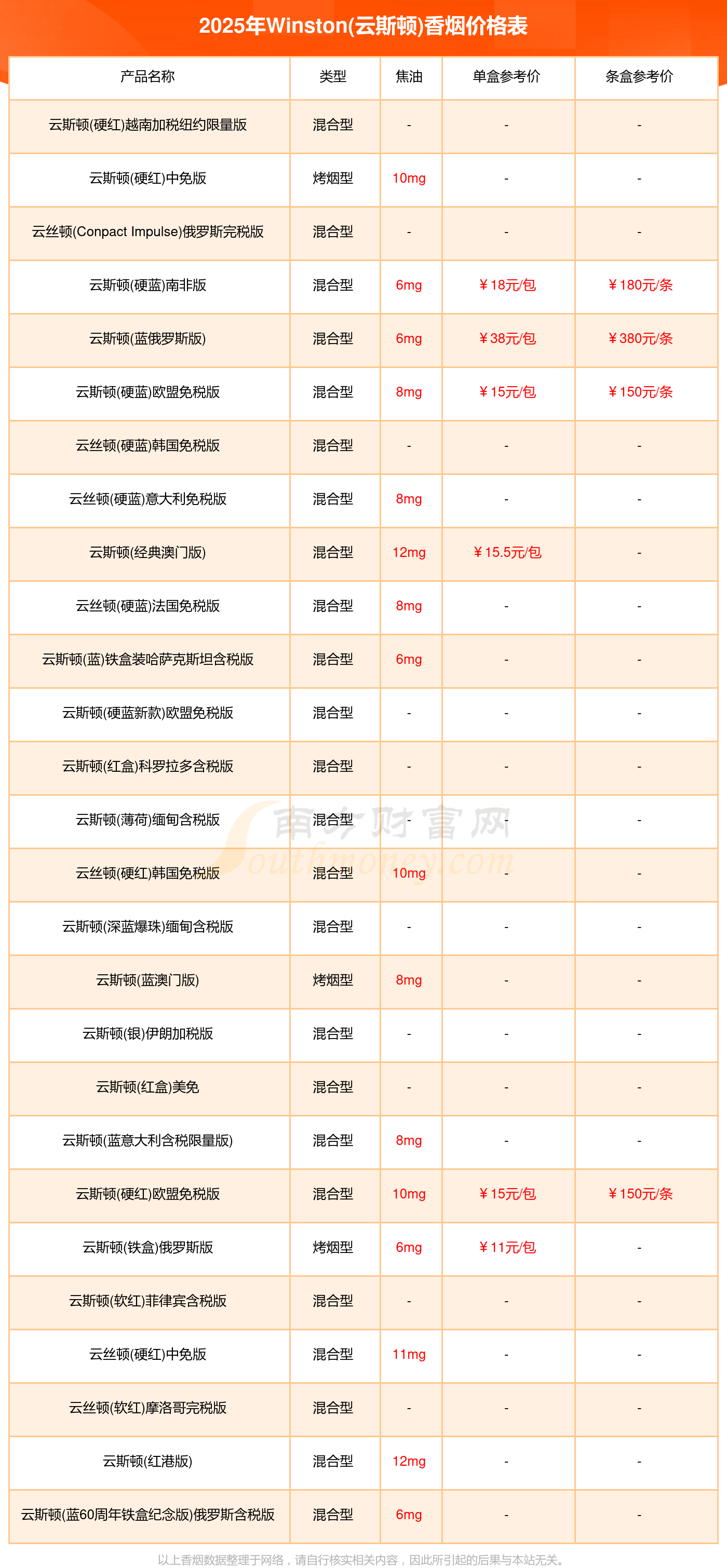 云斯頓(藍(lán)俄羅斯版)參考價38.0元/包、云斯頓(硬藍(lán))南非版參考價18.0元/包、云斯頓(經(jīng)典澳門版)參考價15.5元/包、云斯頓(硬紅)歐盟免稅版參考價15.0元/包。