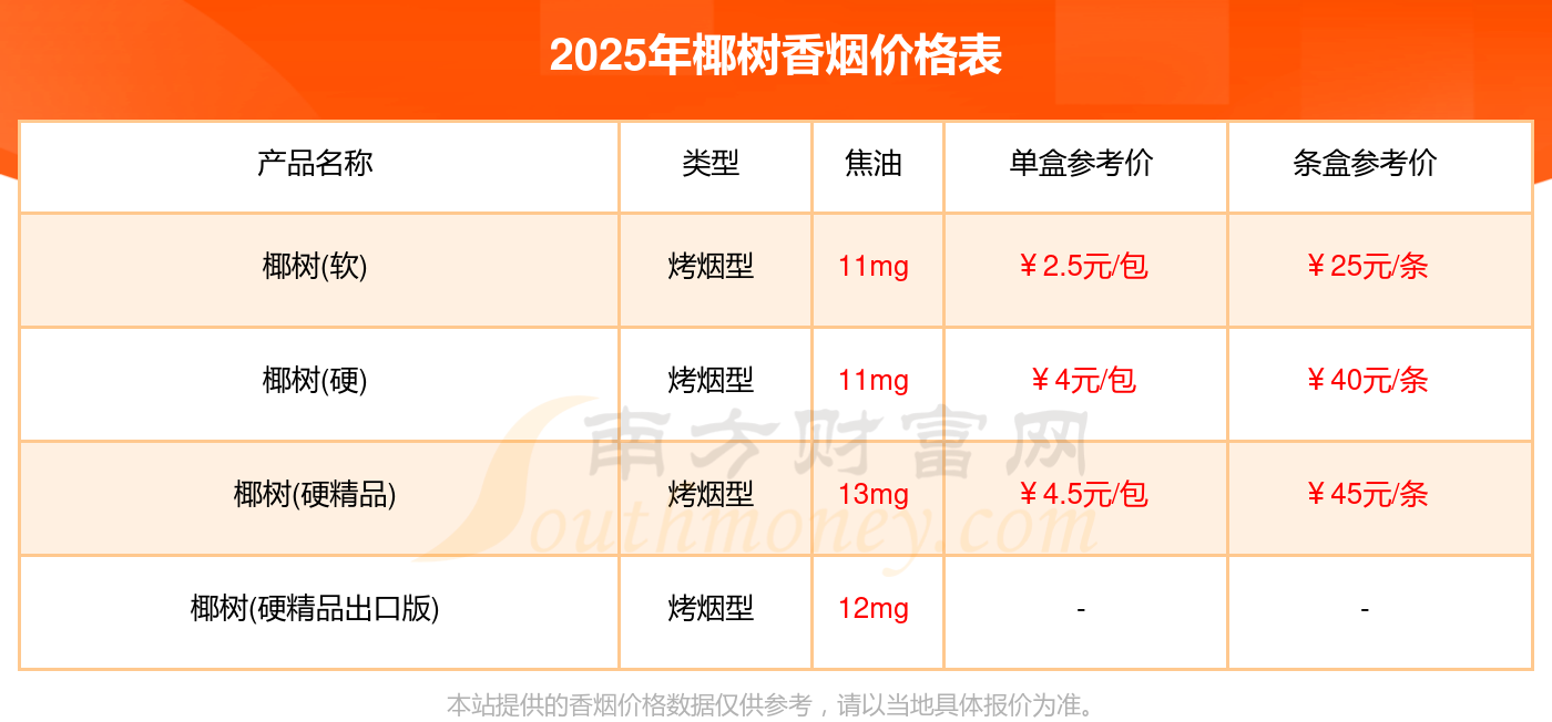 椰樹(硬精品)參考價45.0元/條、椰樹(硬)參考價40.0元/條、椰樹(軟)參考價25.0元/條。