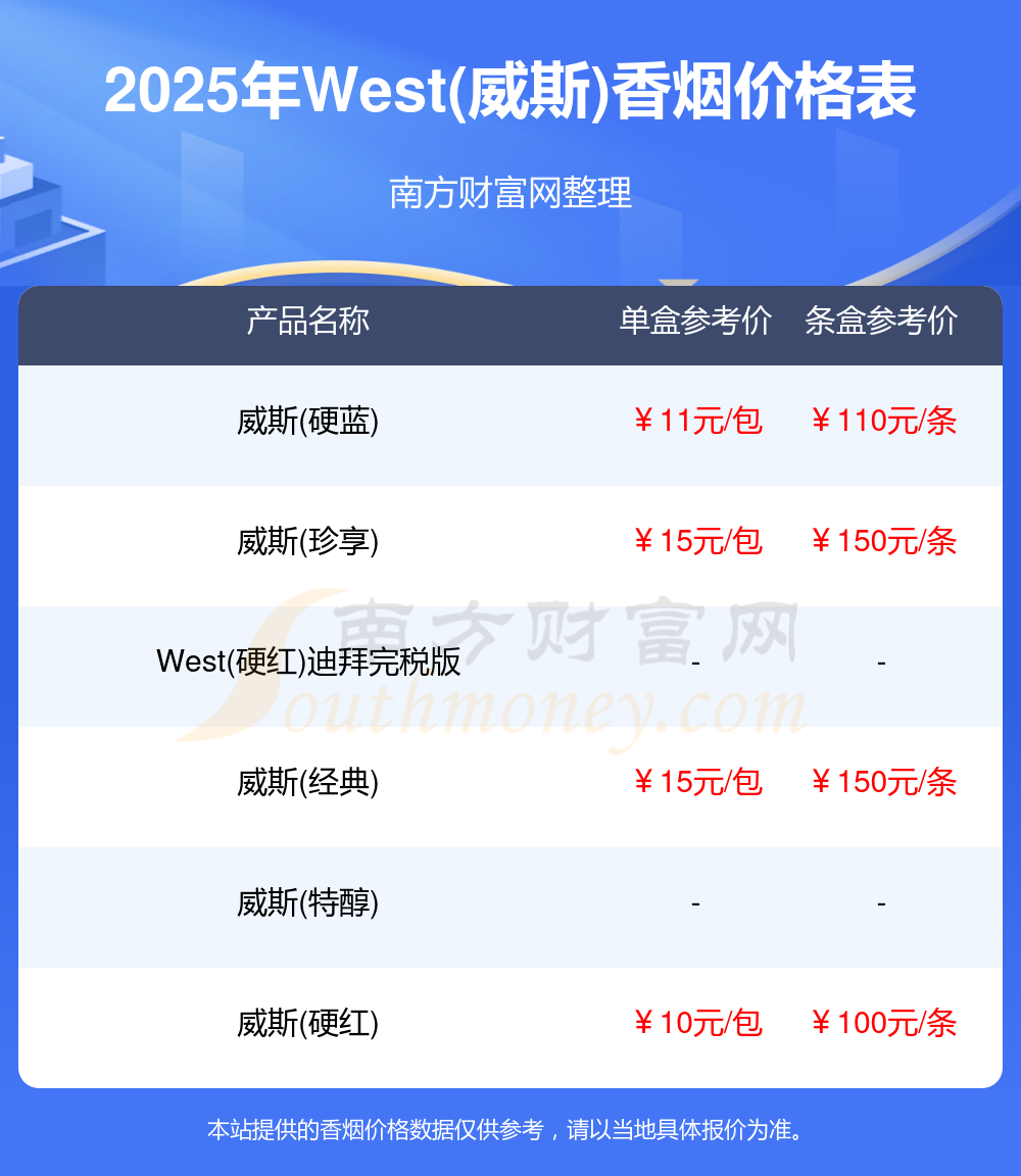 2025年,威斯(經(jīng)典)、威斯(珍享)、威斯(硬藍(lán))、威斯(硬紅)等West(威斯)香煙價(jià)格如下:威斯(經(jīng)典)參考價(jià)150.0元/條、威斯(珍享)參考價(jià)150.0元/條、威斯(硬藍(lán))參考價(jià)110.0元/條、威斯(硬紅)參考價(jià)100.0元/條。