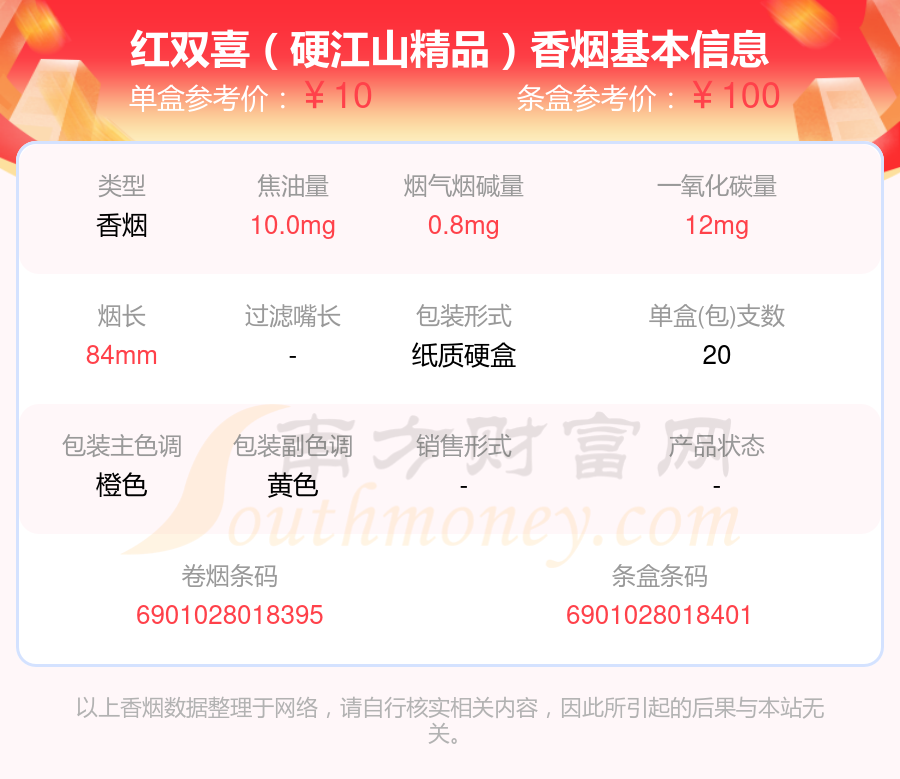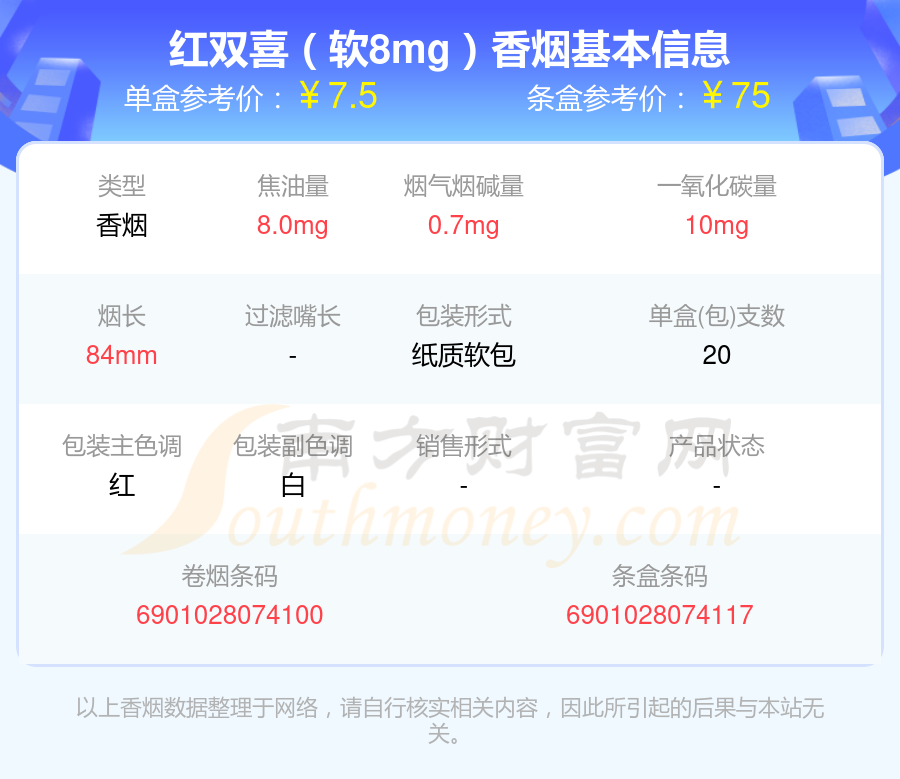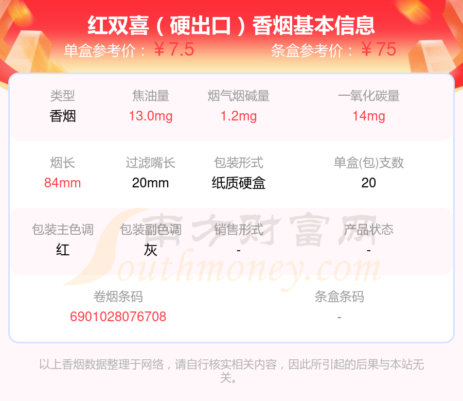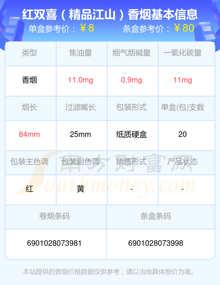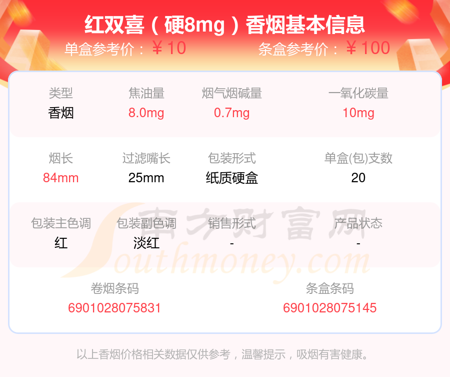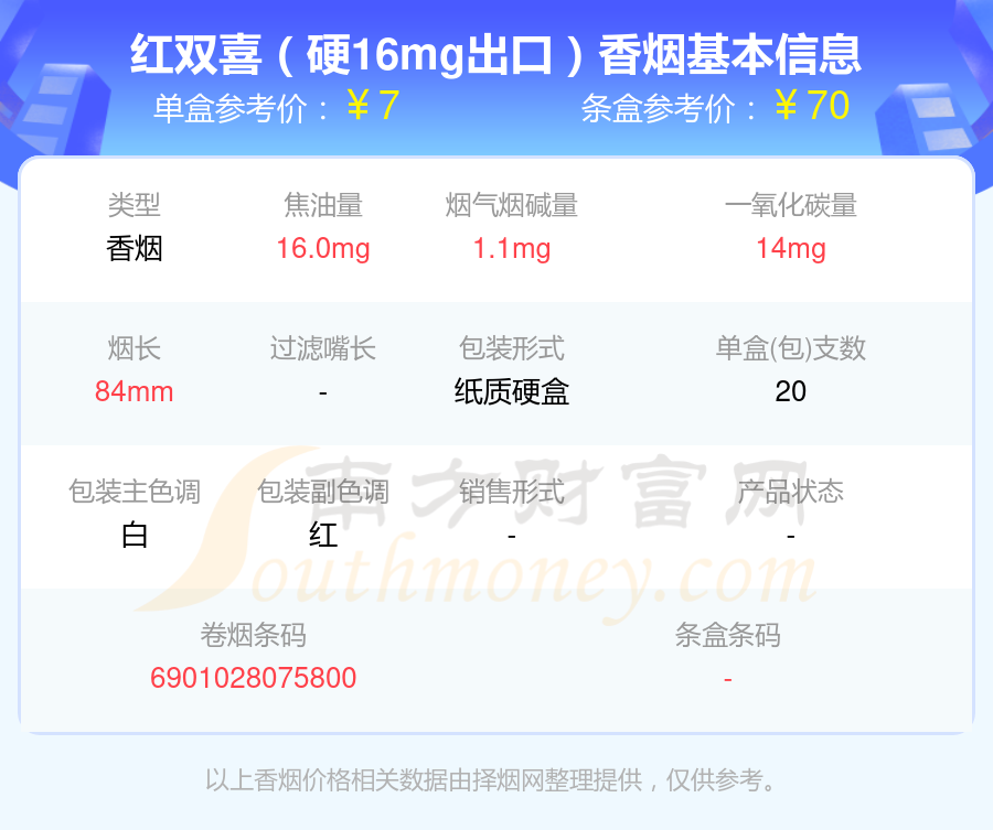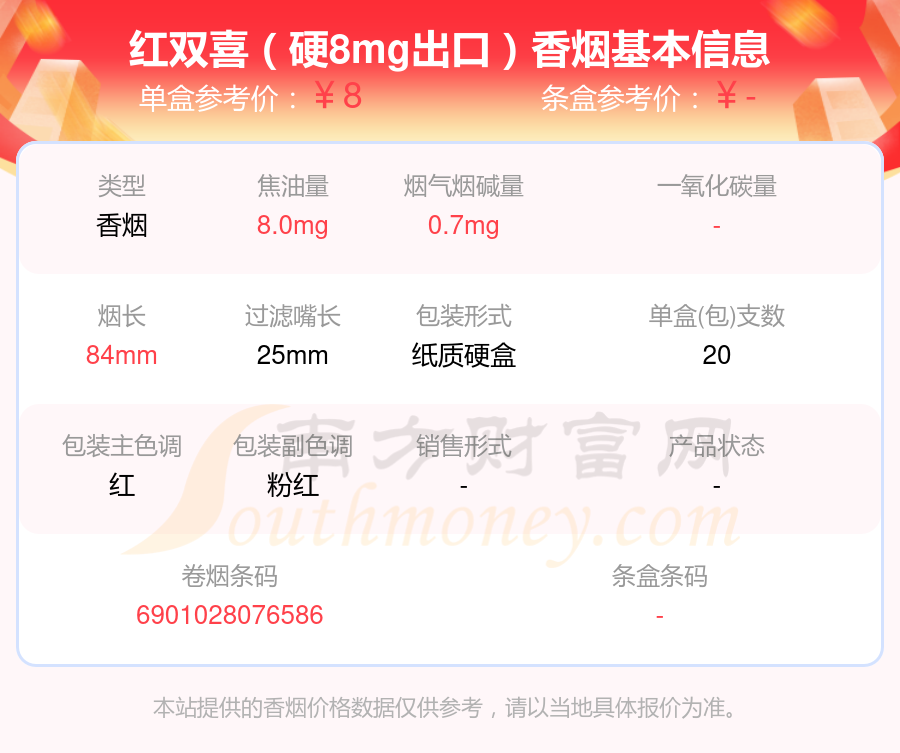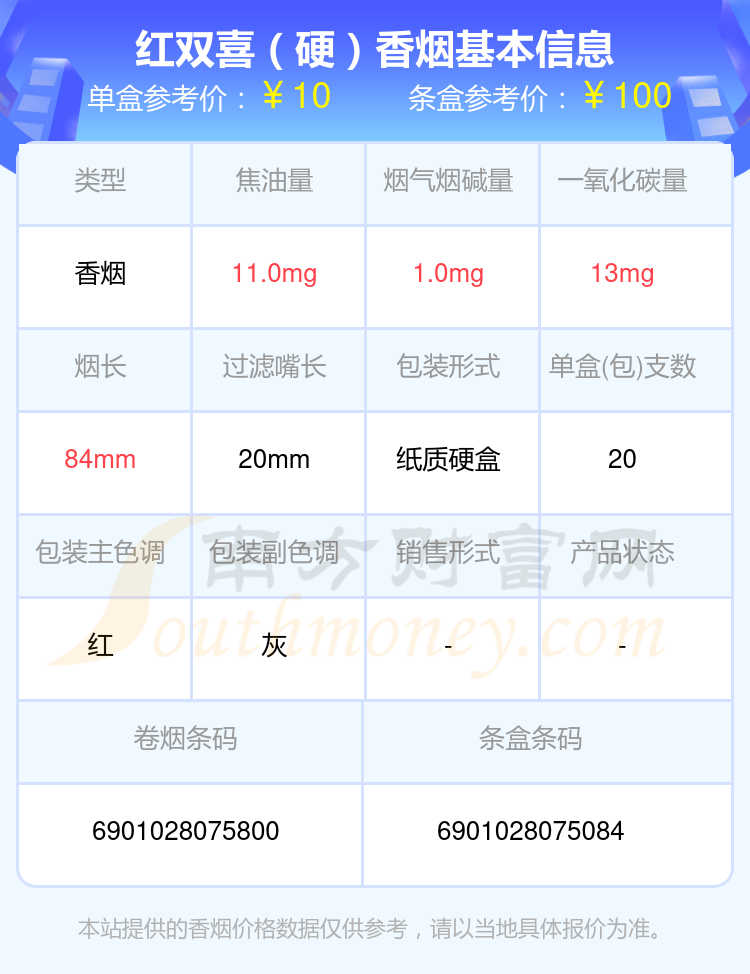紅雙喜(硬特)參考價(jià)9.0元/包、紅雙喜(精品江山)參考價(jià)8.0元/包、紅雙喜(硬8mg出口)參考價(jià)8.0元/包、紅雙喜(硬出口)參考價(jià)7.5元/包、紅雙喜(軟8mg)參考價(jià)7.5元/包、紅雙喜(硬16mg出口)參考價(jià)7.0元/包、紅雙喜(軟)參考價(jià)6.5元/包、紅雙喜(硬)參考價(jià)10.0元/包、紅雙喜(硬江山精品)參考價(jià)10.0元/包、紅雙喜(硬8mg)參考價(jià)10.0元/包等。