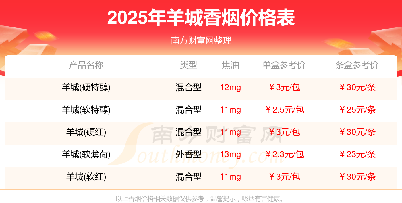 當下羊城價格最高的香煙為羊城(軟紅),參考價3.0元/包,而羊城香煙價格最低的是羊城(軟薄荷),參考價2.3元/包,價格高低差為0.7元/包。
