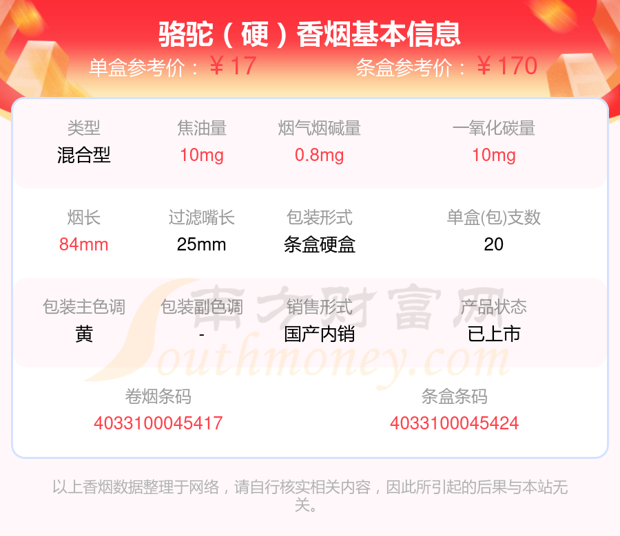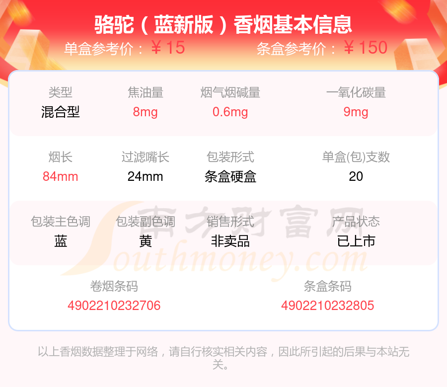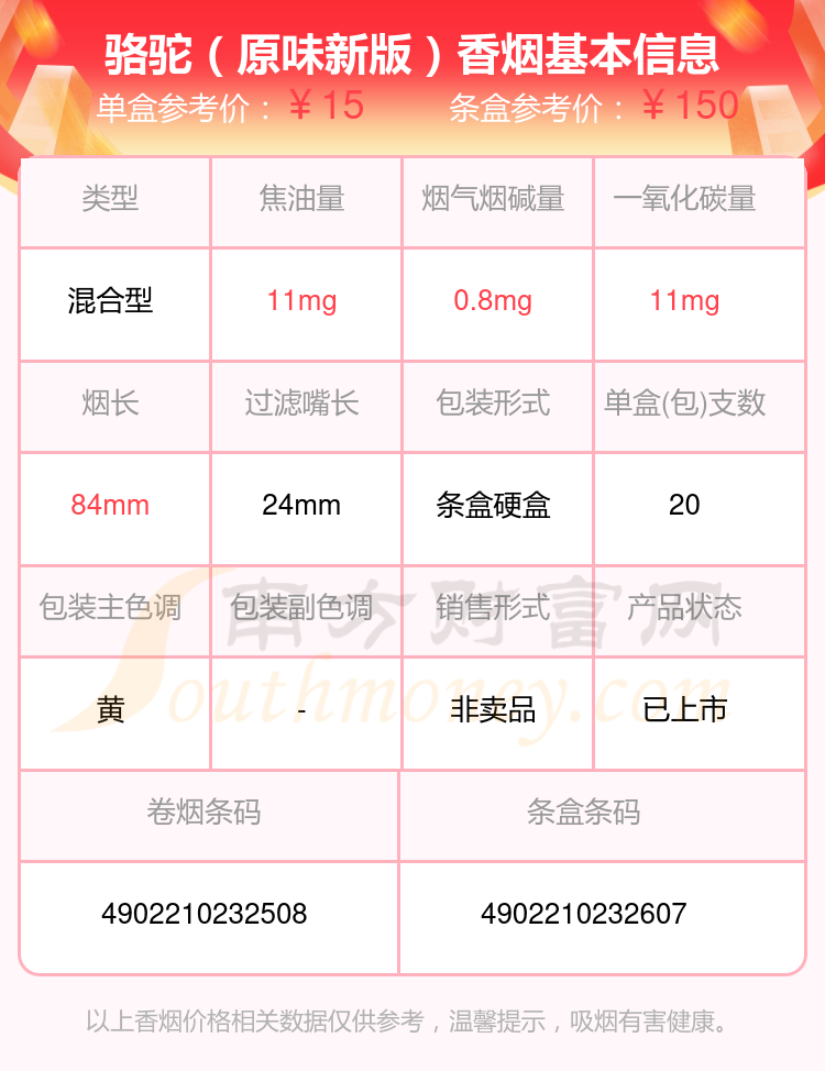 10-20元左右的CAMEL(駱駝)香煙有哪些?擇煙網(wǎng)為大家整理盤點(diǎn),有駱駝(硬)新版、駱駝(白)、駱駝(藍(lán))德國版、駱駝(黑)、駱駝(硬)、駱駝(卡斯特)免稅版、駱駝(煙草版)、駱駝(藍(lán))、駱駝(藍(lán)新版)、駱駝(原味新版)等,詳細(xì)價(jià)格如下:
