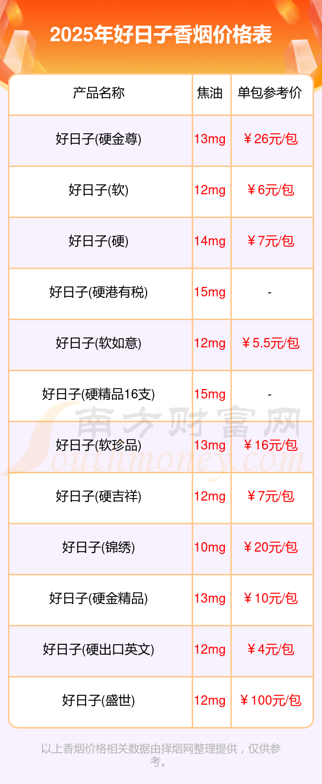 好日子(盛世)參考價(jià)100.0元/包、好日子(硬金尊)參考價(jià)26.0元/包、好日子(錦繡)參考價(jià)20.0元/包、好日子(軟珍品)參考價(jià)16.0元/包、好日子(硬金精品)參考價(jià)10.0元/包、好日子(硬吉祥)參考價(jià)7.0元/包、好日子(硬)參考價(jià)7.0元/包。