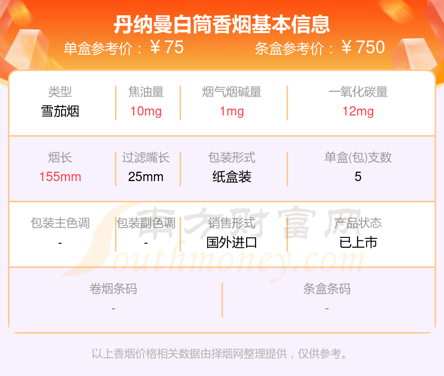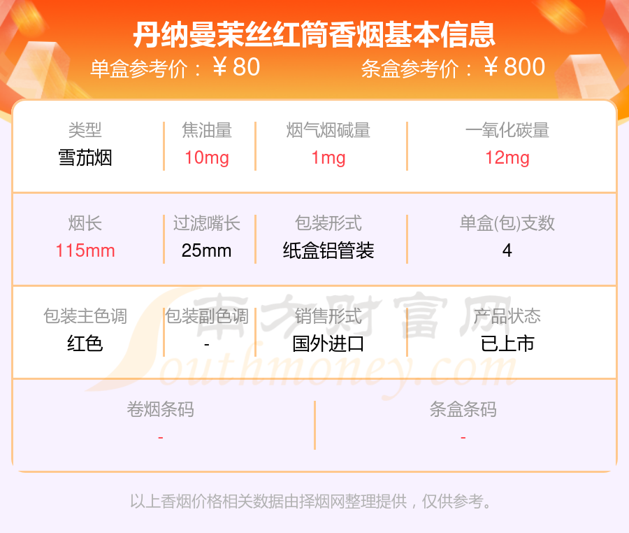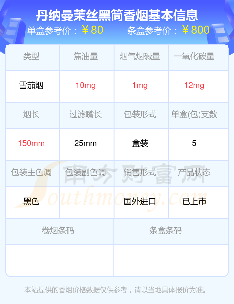60元~90元左右的DANNEMANN(丹納曼)香煙有哪些?擇煙網(wǎng)為大家整理盤點,分別有:丹納曼茉絲黑筒、丹納曼茉絲紅筒、丹納曼白筒、丹納曼(特選所羅門)等,具體價格如下:
