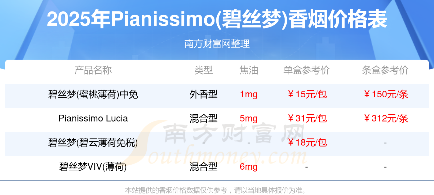2025年P(guān)ianissimo(碧絲夢(mèng))香煙Pianissimo Lucia、碧絲夢(mèng)(蜜桃薄荷)中免等最新價(jià)格如下:Pianissimo Lucia參考價(jià)312.0元/條、碧絲夢(mèng)(蜜桃薄荷)中免參考價(jià)150.0元/條。