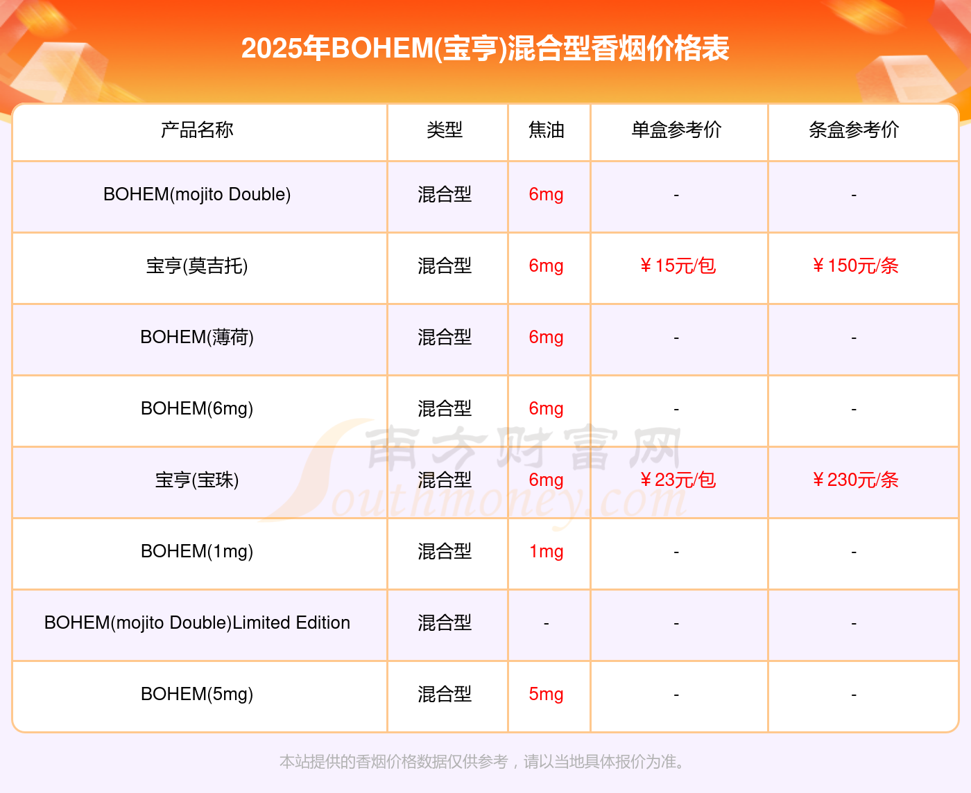 2025年BOHEM(寶亨)混合型香煙寶亨(寶珠)、寶亨(莫吉托)等最新價格如下: