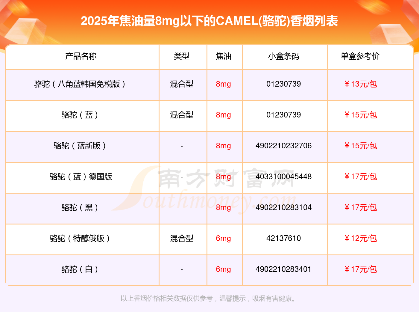 擇煙網(wǎng)為大家盤點了CAMEL(駱駝)香煙焦油量8mg以下的,分別有駱駝(八角藍韓國免稅版)、駱駝(藍)、駱駝(藍新版)、駱駝(藍)德國版、駱駝(黑)、駱駝(特醇俄版)、駱駝(白)等,具體價格如下: