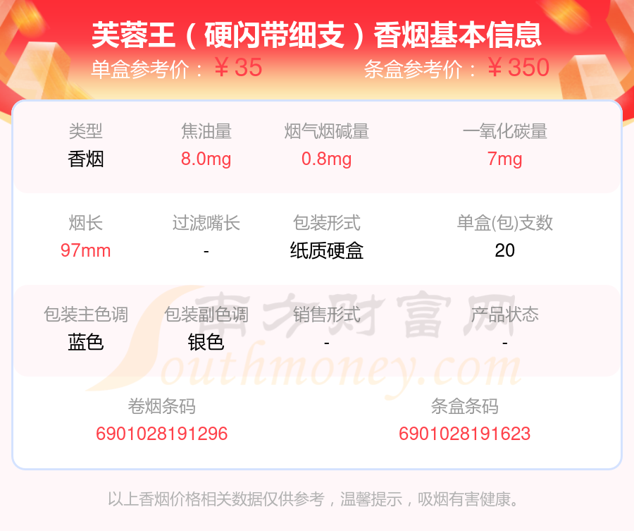 芙蓉王(硬閃帶細(xì)支)單盒參考價(jià):35元