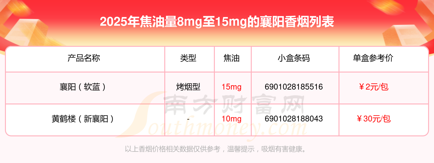 擇煙網(wǎng)為大家盤(pán)點(diǎn)了焦油量8mg至15mg的襄陽(yáng)香煙,有襄陽(yáng)(軟藍(lán))、黃鶴樓(新襄陽(yáng))等,詳細(xì)價(jià)格如下: