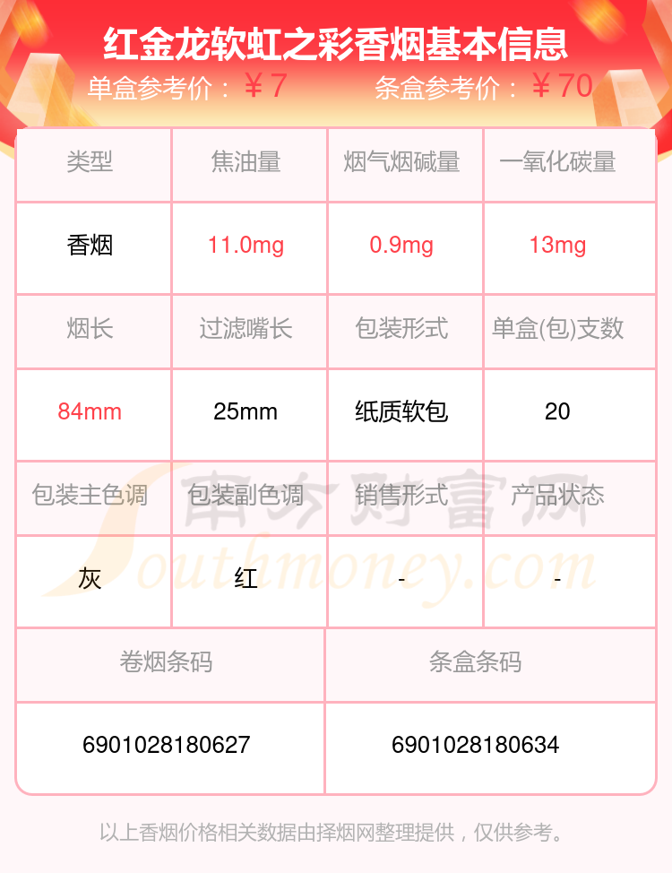 紅金龍軟虹之彩單盒參考價(jià):7元
