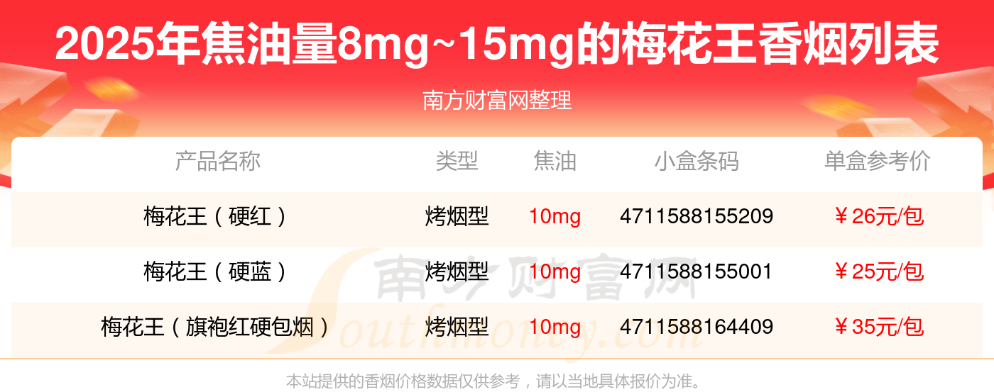 梅花王香煙焦油量8mg~15mg的煙分別有梅花王(硬紅)參考價26.0元/包、梅花王(硬藍)參考價25.0元/包、梅花王(旗袍紅硬包煙)參考價35.0元/包等。
