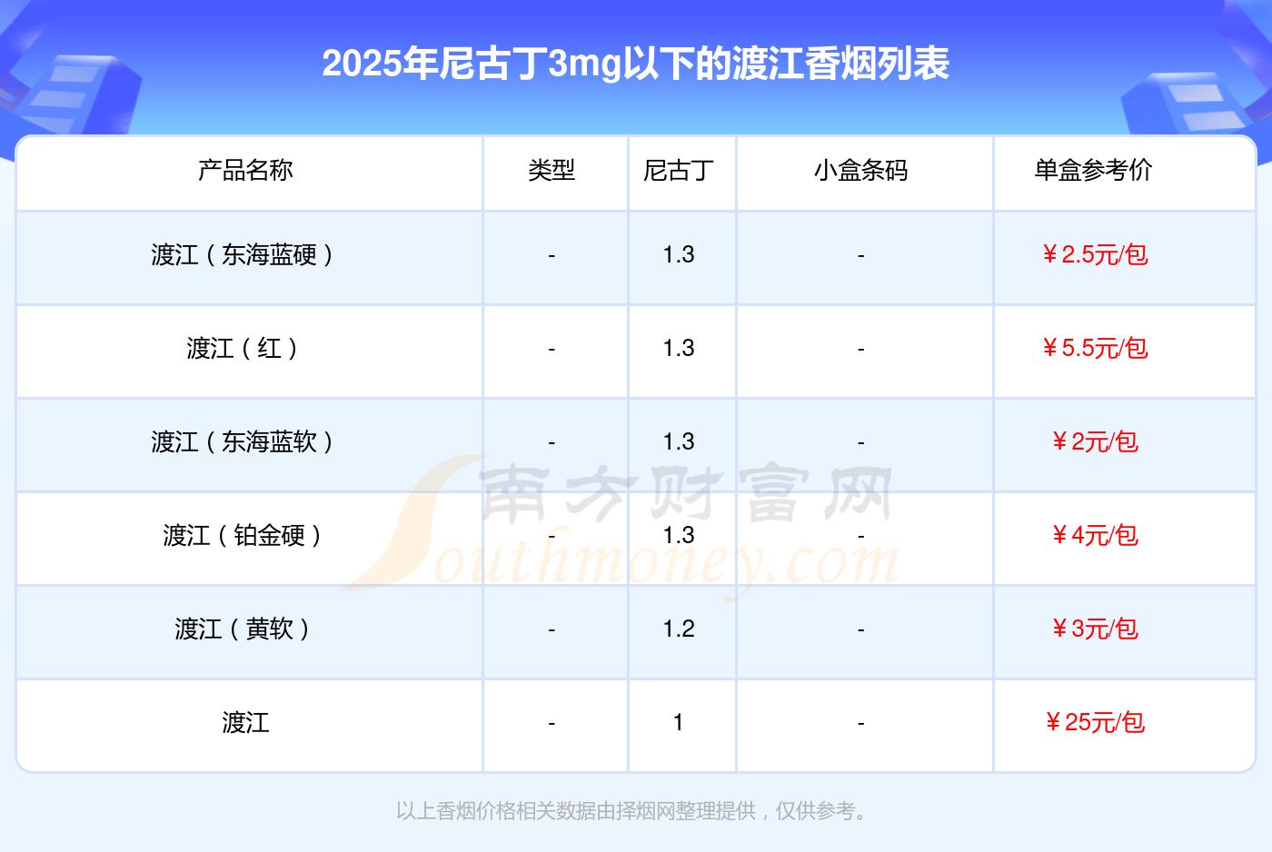 渡江香煙尼古丁3mg以下的煙有渡江(東海藍(lán)硬)、渡江(紅)、渡江(東海藍(lán)軟)、渡江(鉑金硬)、渡江(黃軟)、渡江等,具體價格如下:
