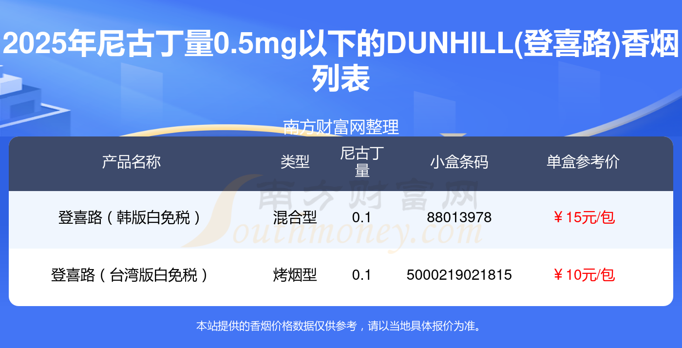 尼古丁量0.5mg以下的DUNHILL(登喜路)香煙有哪些?擇煙網(wǎng)為大家整理盤點(diǎn),分別有:登喜路(韓版白免稅)、登喜路(臺(tái)灣版白免稅)等,具體價(jià)格如下: