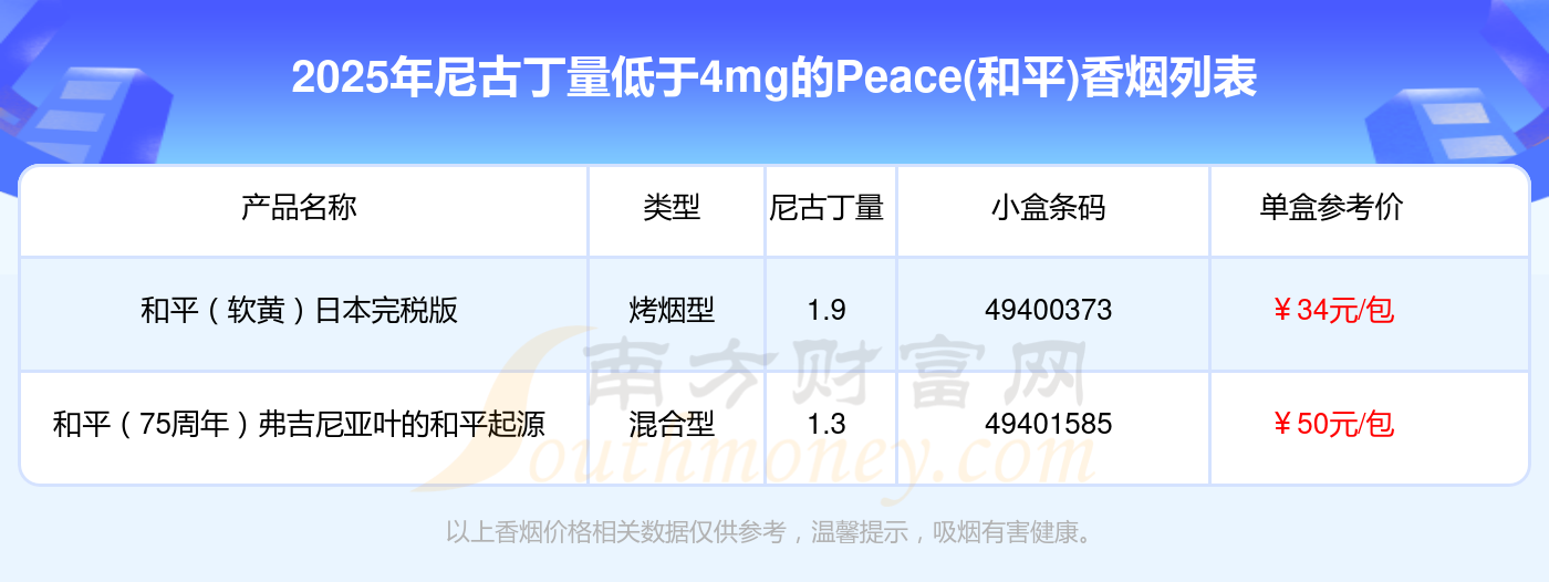 擇煙網(wǎng)為大家盤點(diǎn)了Peace(和平)香煙尼古丁量低于4mg的煙,有以下這些: