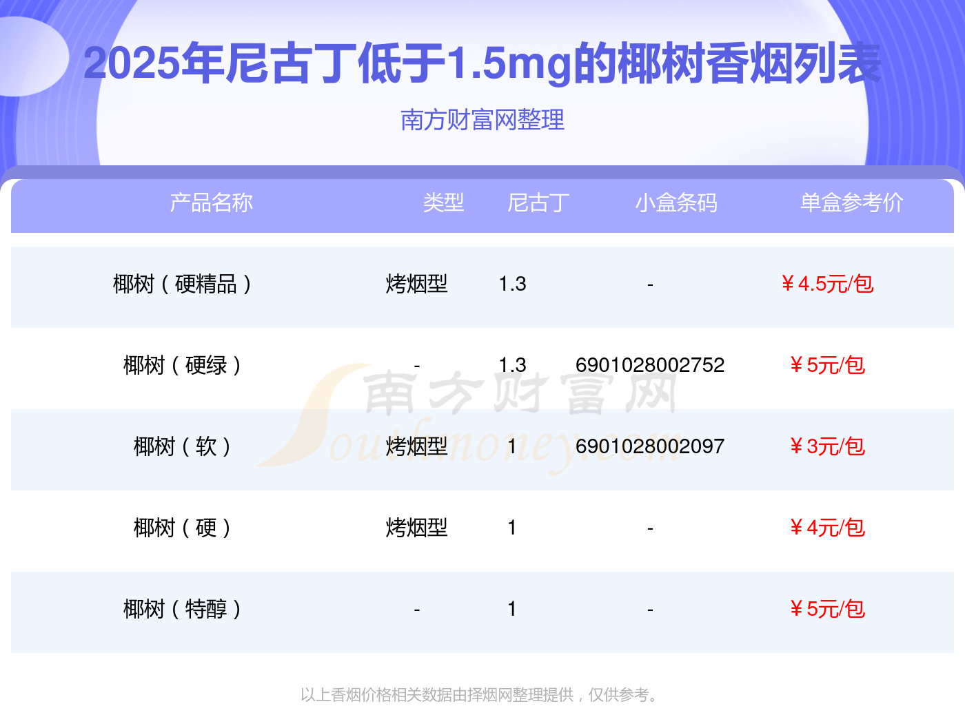 椰樹香煙尼古丁低于1.5mg的煙分別有椰樹(硬精品)參考價(jià)4.5元/包、椰樹(硬綠)參考價(jià)5元/包、椰樹(軟)參考價(jià)3元/包、椰樹(硬)參考價(jià)4元/包、椰樹(特醇)參考價(jià)5元/包等。