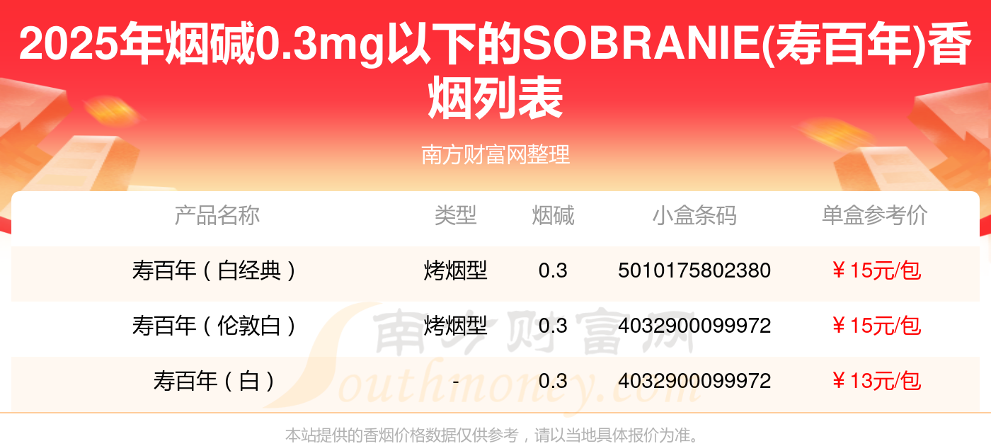 SOBRANIE(壽百年)香煙煙堿0.3mg以下的煙有壽百年(白經(jīng)典)、壽百年(倫敦白)、壽百年(白)等,詳細價格如下: