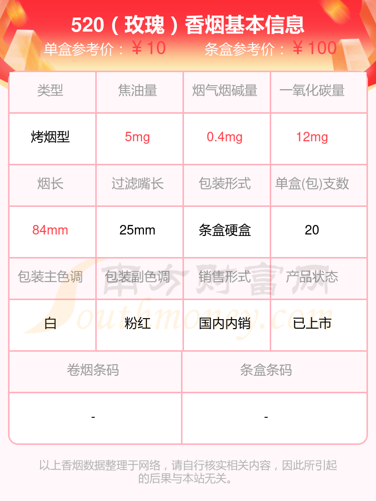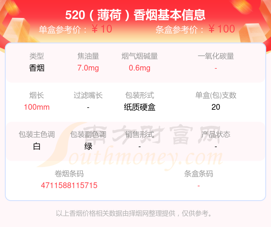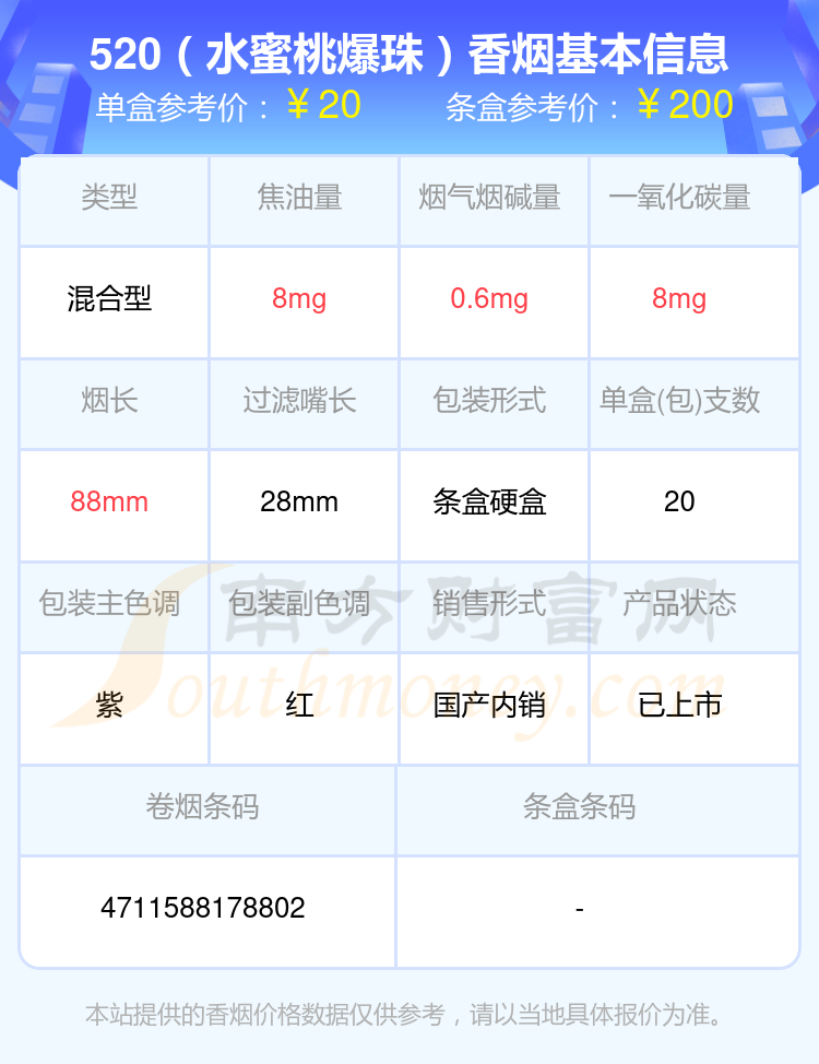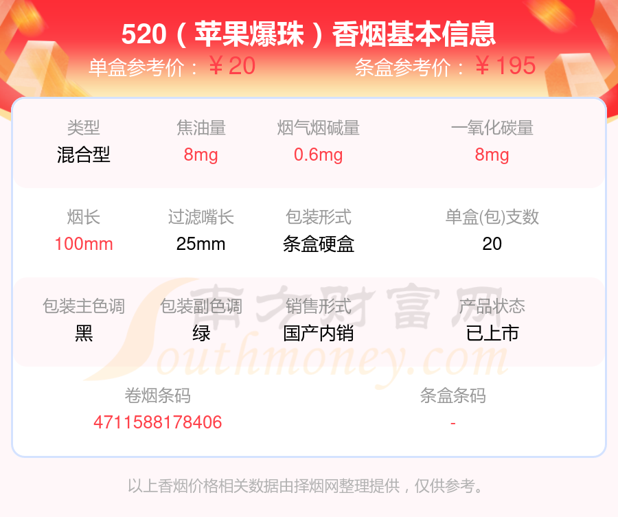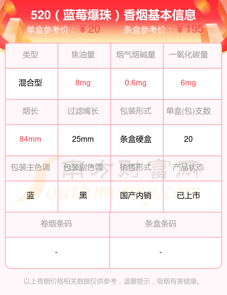 520(哈密瓜爆珠)參考價20元/包、520(SLIMS)參考價10.0元/包、520(薄荷)參考價10.0元/包、520(薄荷細支爆珠)參考價20元/包、520(藍莓爆珠)參考價20元/包、520(蘋果爆珠)參考價20元/包、520(哈密瓜細支爆珠)參考價20元/包、520(藍玫瑰101)參考價9.0元/包、520(水蜜桃爆珠)參考價20元/包、520(玫瑰)參考價10元/包等。