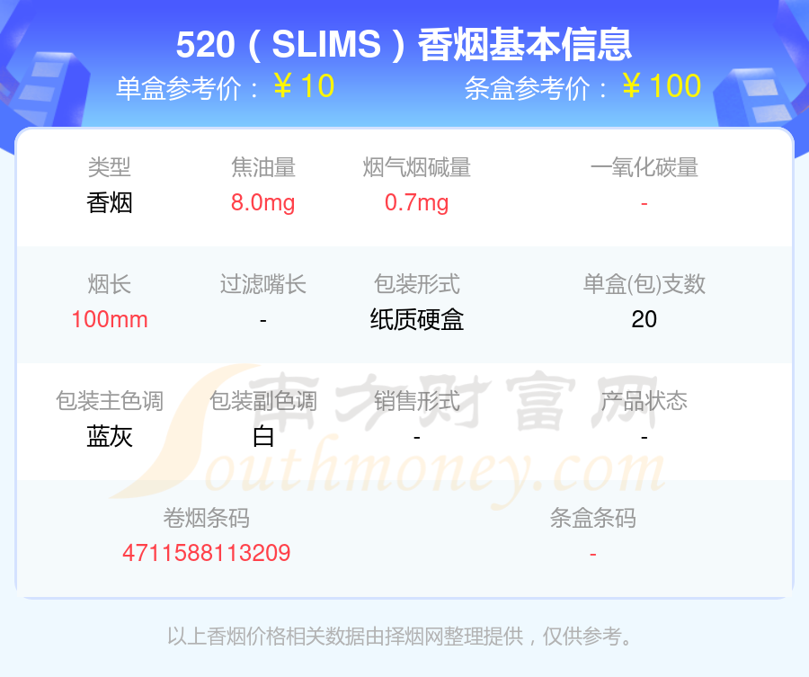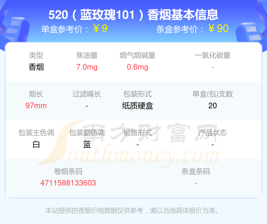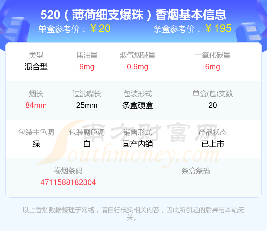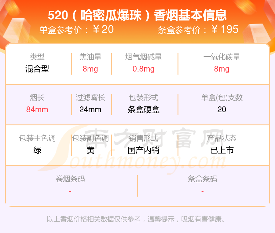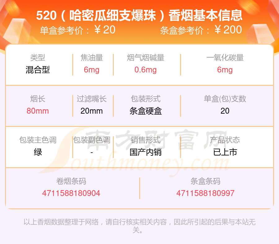 520(哈密瓜爆珠)參考價20元/包、520(SLIMS)參考價10.0元/包、520(薄荷)參考價10.0元/包、520(薄荷細支爆珠)參考價20元/包、520(藍莓爆珠)參考價20元/包、520(蘋果爆珠)參考價20元/包、520(哈密瓜細支爆珠)參考價20元/包、520(藍玫瑰101)參考價9.0元/包、520(水蜜桃爆珠)參考價20元/包、520(玫瑰)參考價10元/包等。