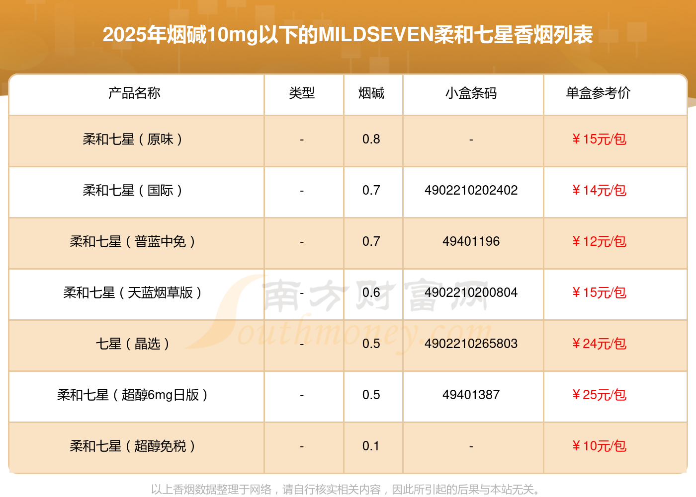 煙堿10mg以下的MILDSEVEN柔和七星香煙有哪些?擇煙網(wǎng)為大家整理盤點(diǎn),有柔和七星(原味)、柔和七星(國(guó)際)、柔和七星(普藍(lán)中免)、柔和七星(天藍(lán)煙草版)、七星(晶選)、柔和七星(超醇6mg日版)、柔和七星(超醇免稅)等,詳細(xì)價(jià)格如下:
