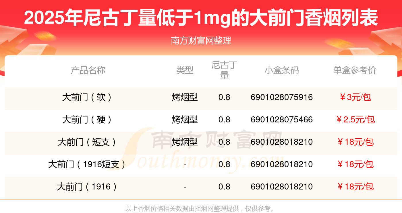 大前門(mén)香煙尼古丁量低于1mg的煙有大前門(mén)(軟)、大前門(mén)(硬)、大前門(mén)(短支)、大前門(mén)(1916短支)、大前門(mén)(1916)等,具體價(jià)格如下: