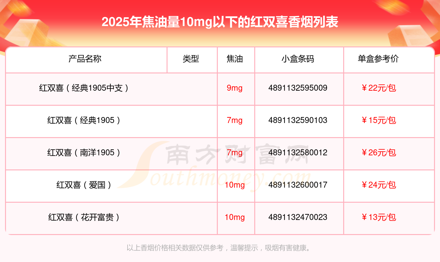 擇煙網(wǎng)為大家盤點了紅雙喜香煙焦油量10mg以下的,分別有紅雙喜(經(jīng)典1905中支)、紅雙喜(經(jīng)典1905)、紅雙喜(南洋1905)、紅雙喜(愛國)、紅雙喜(花開富貴)等,具體價格如下: