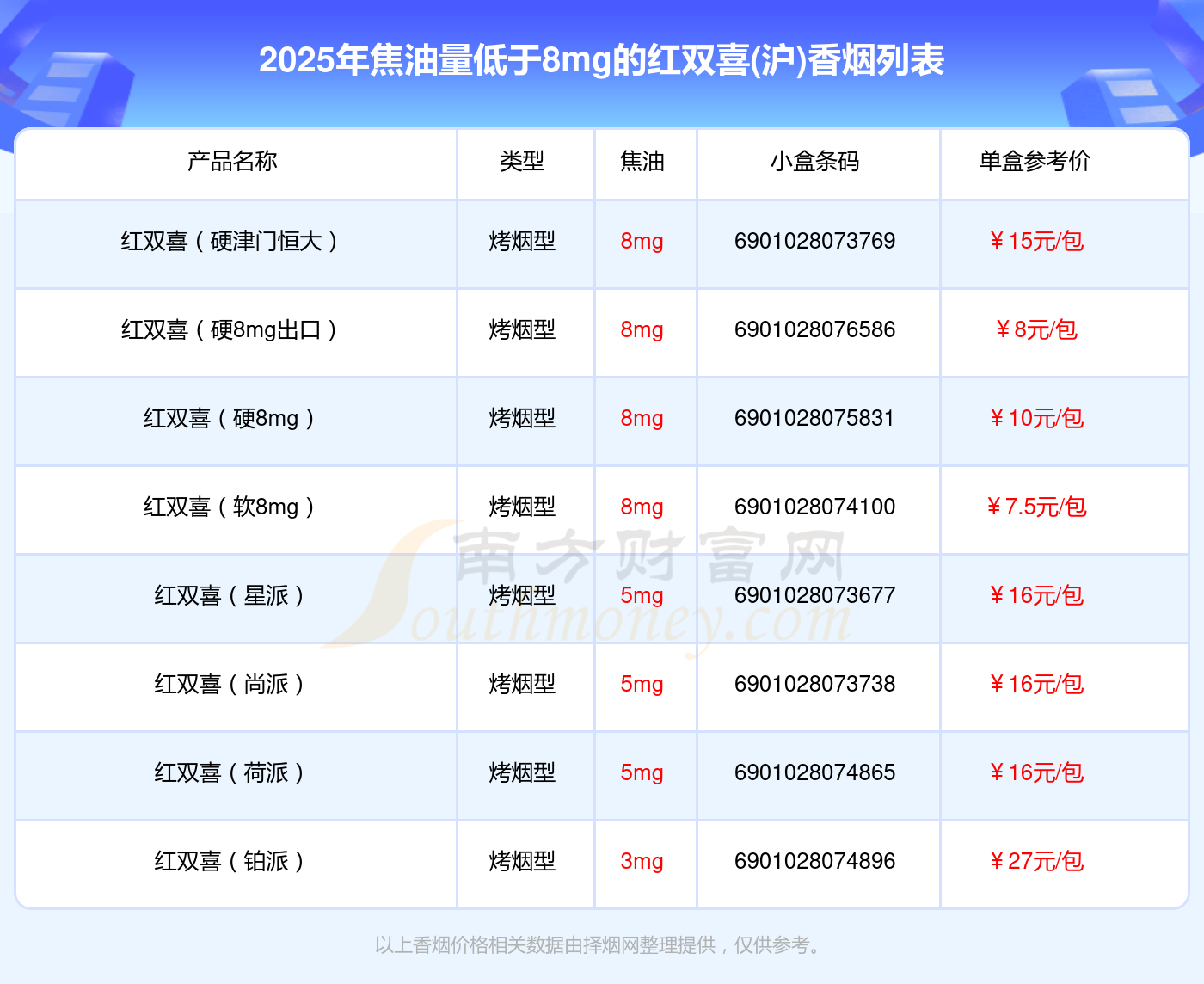 紅雙喜(滬)香煙焦油量低于8mg的有哪些?擇煙網為大家整理提供,分別有: