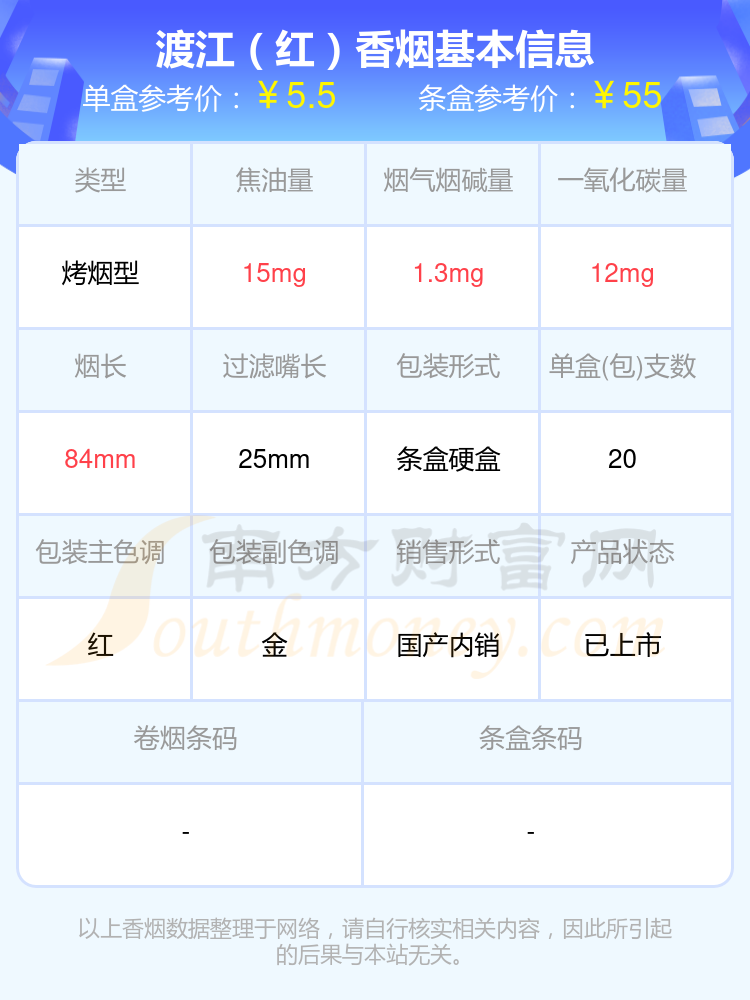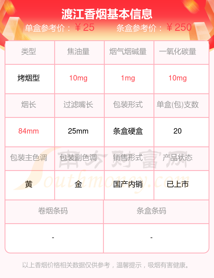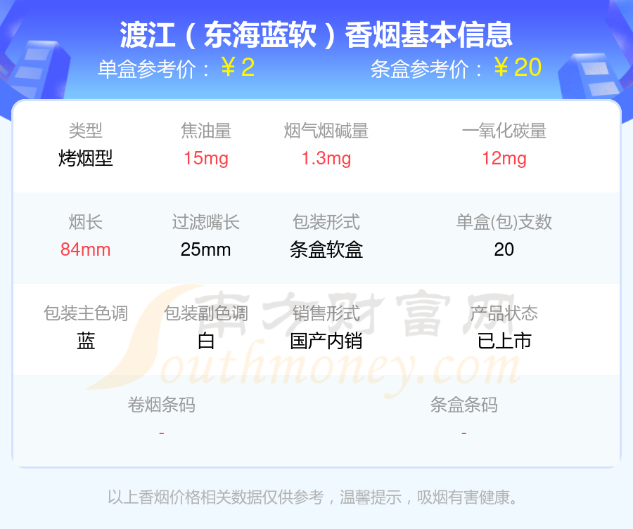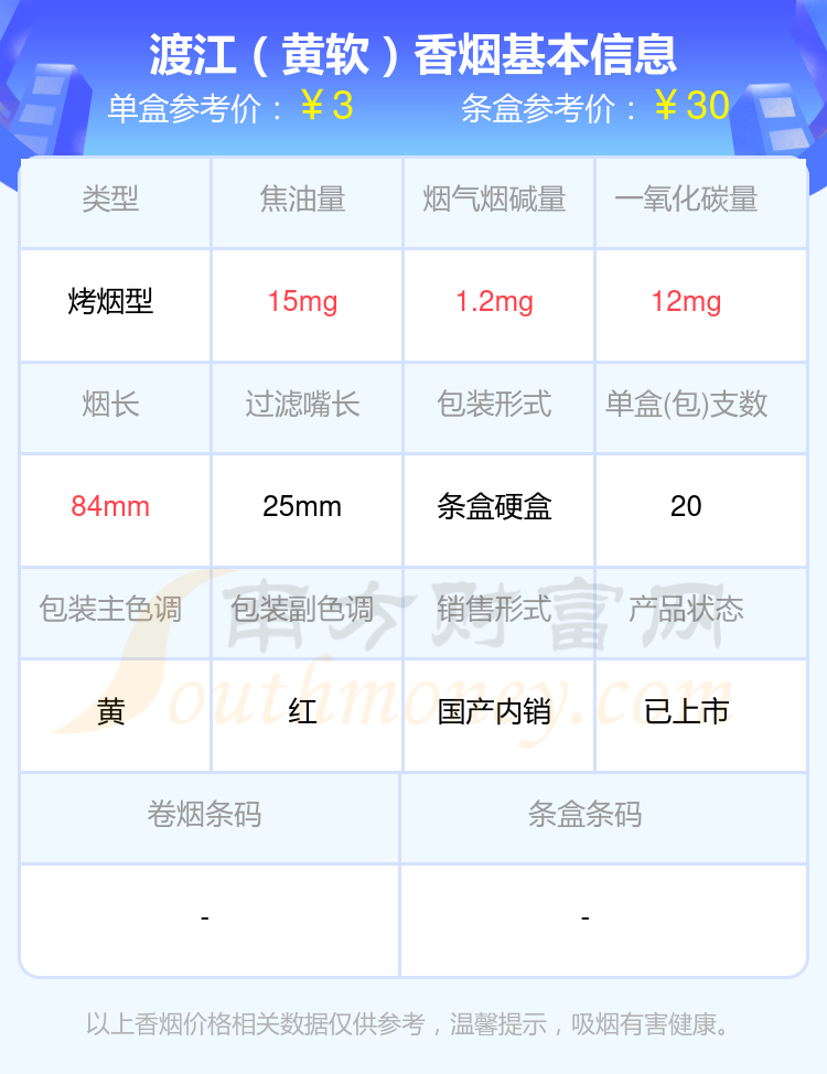 渡江(東海藍(lán)硬)參考價(jià)2.5元/包、渡江(紅)參考價(jià)5.5元/包、渡江(東海藍(lán)軟)參考價(jià)2元/包、渡江(黃軟)參考價(jià)3元/包、渡江(鉑金硬)參考價(jià)4元/包、渡江參考價(jià)25元/包等。