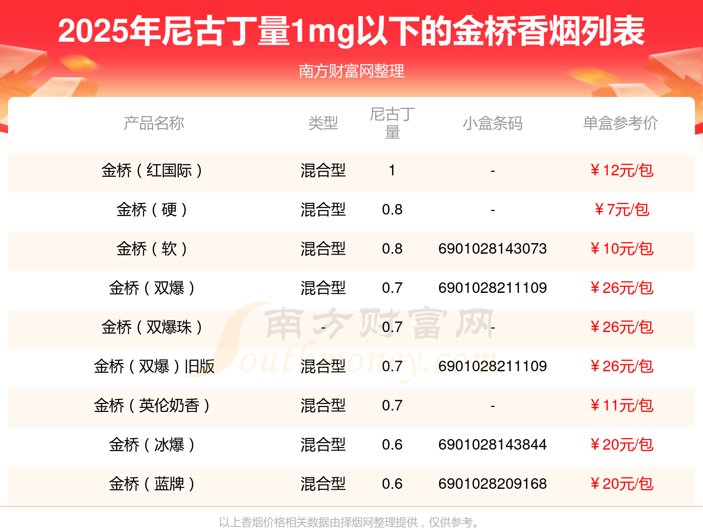 金橋(紅國際)參考價12元/包、金橋(硬)參考價7元/包、金橋(軟)參考價10.0元/包、金橋(雙爆)參考價26元/包、金橋(雙爆珠)參考價26元/包、金橋(雙爆)舊版參考價26.0元/包、金橋(英倫奶香)參考價11元/包、金橋(冰爆)參考價20元/包、金橋(藍牌)參考價20元/包等。