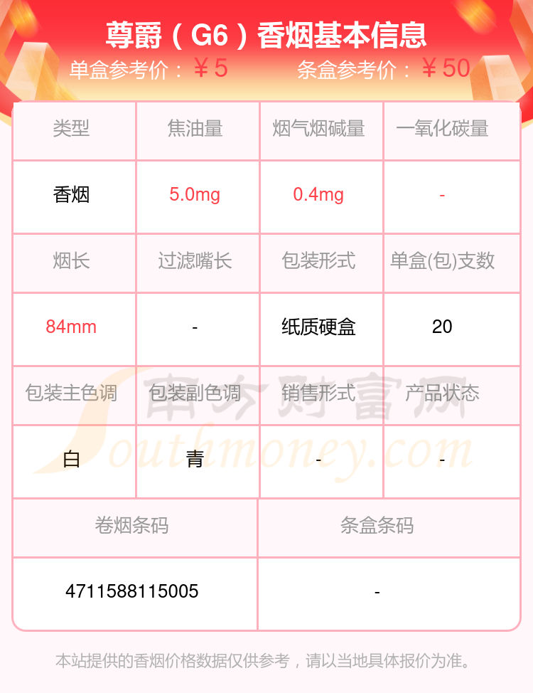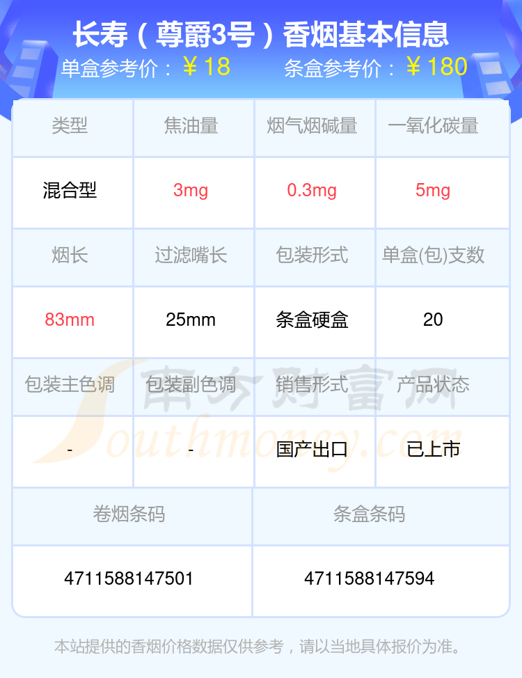 尊爵(G6)參考價5.0元/包、尊爵(G3)參考價5.0元/包、長壽(尊爵3號)參考價18元/包、尊爵(G1)參考價16.0元/包等。