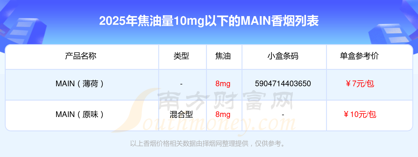擇煙網(wǎng)為大家盤點了焦油量10mg以下的MAIN香煙,有以下這些: