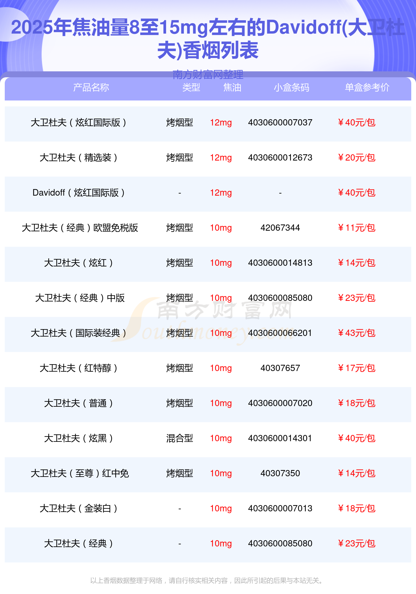 Davidoff(大衛(wèi)杜夫)香煙焦油量8至15mg左右的煙有哪些?擇煙網(wǎng)為大家整理提供,分別有:大衛(wèi)杜夫(炫紅國(guó)際版)、大衛(wèi)杜夫(精選裝)、Davidoff(炫紅國(guó)際版)、大衛(wèi)杜夫(經(jīng)典)歐盟免稅版、大衛(wèi)杜夫(炫紅)、大衛(wèi)杜夫(經(jīng)典)中版、大衛(wèi)杜夫(國(guó)際裝經(jīng)典)、大衛(wèi)杜夫(紅特醇)、大衛(wèi)杜夫(普通)、大衛(wèi)杜夫(炫黑)等,具體價(jià)格如下: