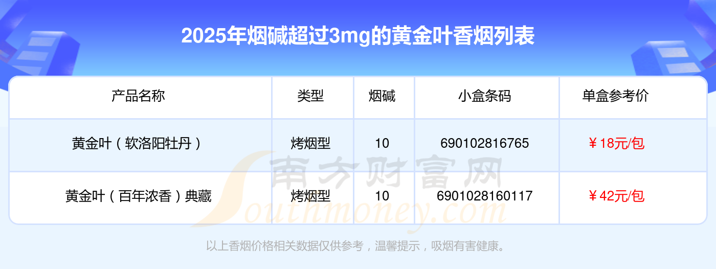 煙堿超過(guò)3mg的黃金葉香煙有哪些?擇煙網(wǎng)為大家整理盤(pán)點(diǎn),有黃金葉(軟洛陽(yáng)牡丹)、黃金葉(百年濃香)典藏等,詳細(xì)價(jià)格如下: