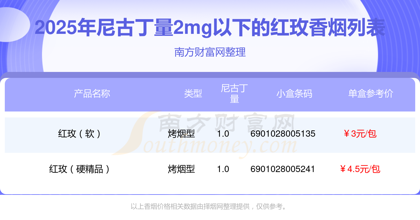 擇煙網(wǎng)為大家盤點(diǎn)了尼古丁量2mg以下的紅玫香煙,有紅玫(軟)、紅玫(硬精品)等,詳細(xì)價(jià)格如下: