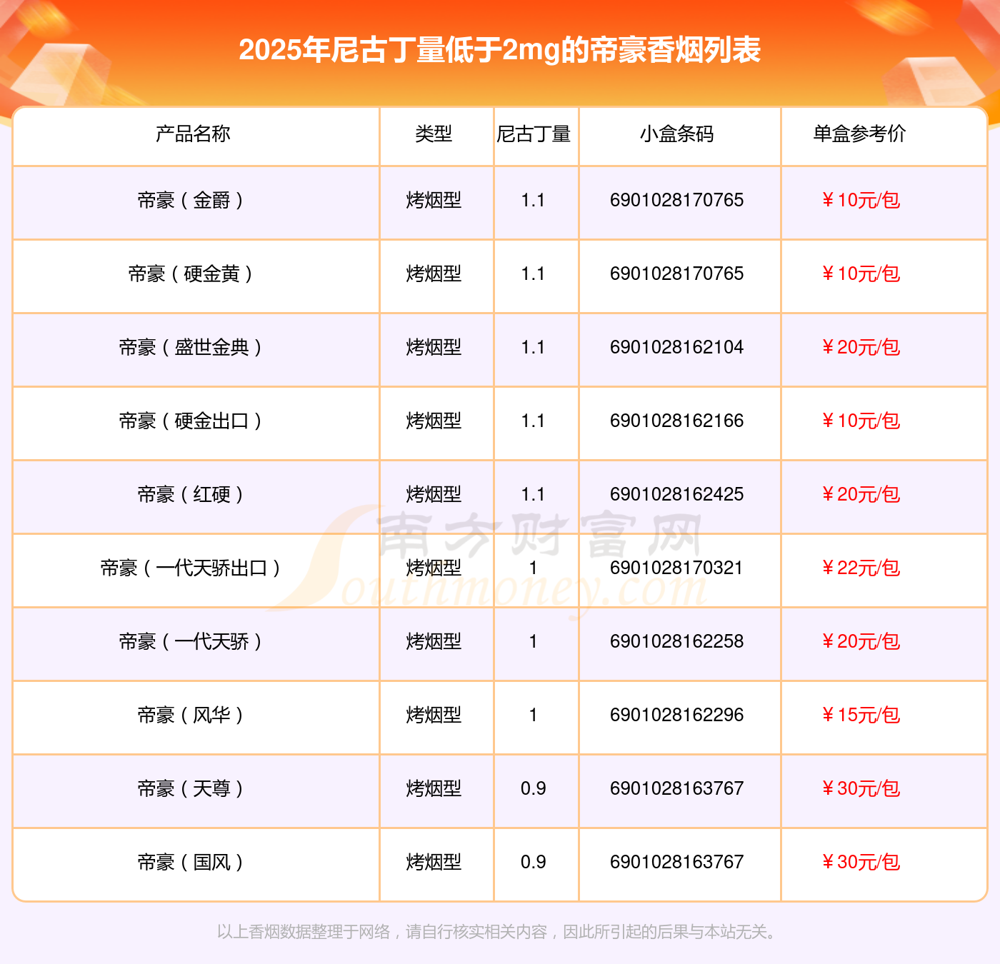 帝豪香煙尼古丁量低于2mg的煙分別有帝豪(金爵)參考價10元/包、帝豪(硬金黃)參考價10元/包、帝豪(盛世金典)參考價20元/包、帝豪(硬金出口)參考價10元/包、帝豪(紅硬)參考價20元/包、帝豪(一代天驕出口)參考價22元/包、帝豪(一代天驕)參考價20元/包、帝豪(風華)參考價15元/包、帝豪(天尊)參考價30元/包、帝豪(國風)參考價30元/包等。
