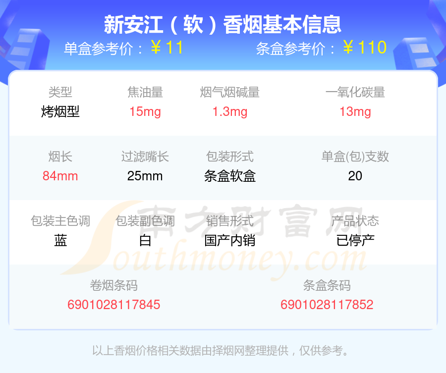 新安江香煙焦油量8-15mg的煙有哪些?擇煙網(wǎng)為大家整理提供,分別有:新安江(軟)、新安江(藍(lán))、新安江(銀紅)等,具體價(jià)格如下: