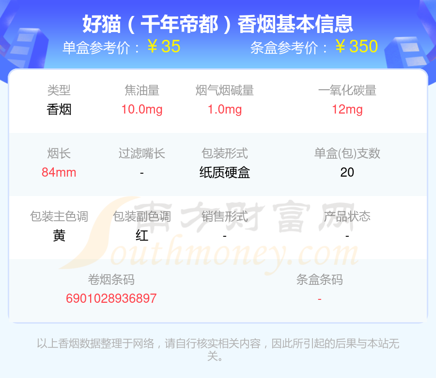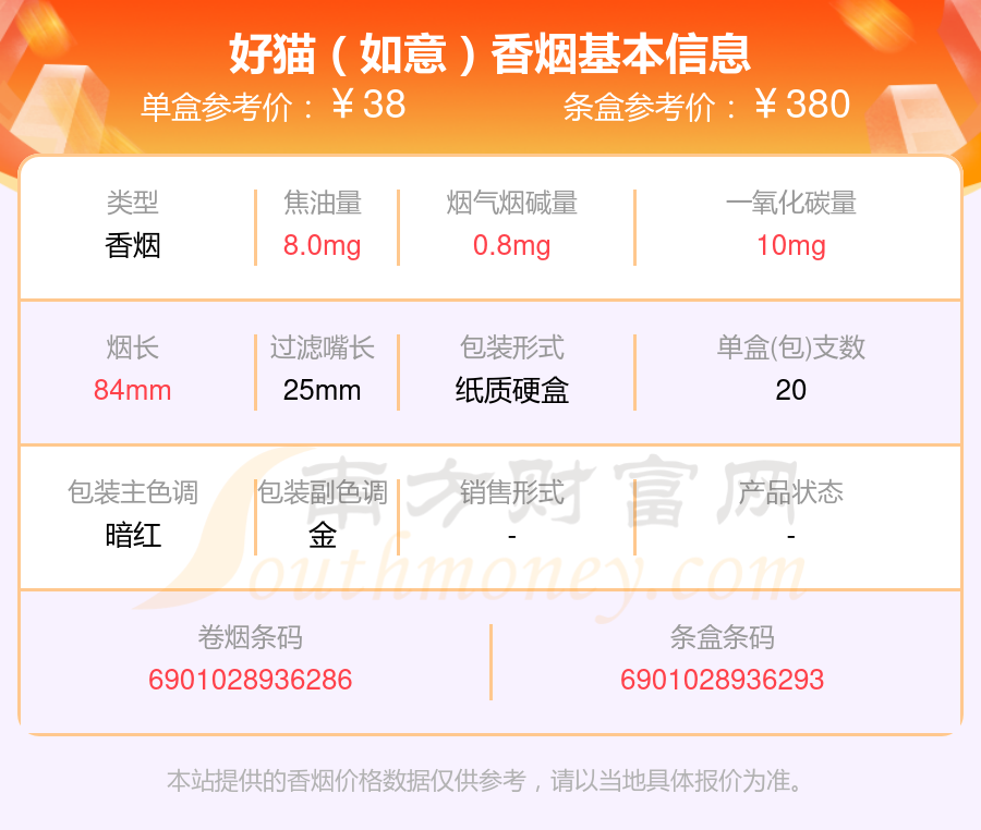 擇煙網(wǎng)為大家盤點(diǎn)了好貓香煙三十至四十元左右的,分別有好貓(細(xì)支天賦)、好貓(如意)、好貓(千年帝都)等,詳細(xì)價格如下: