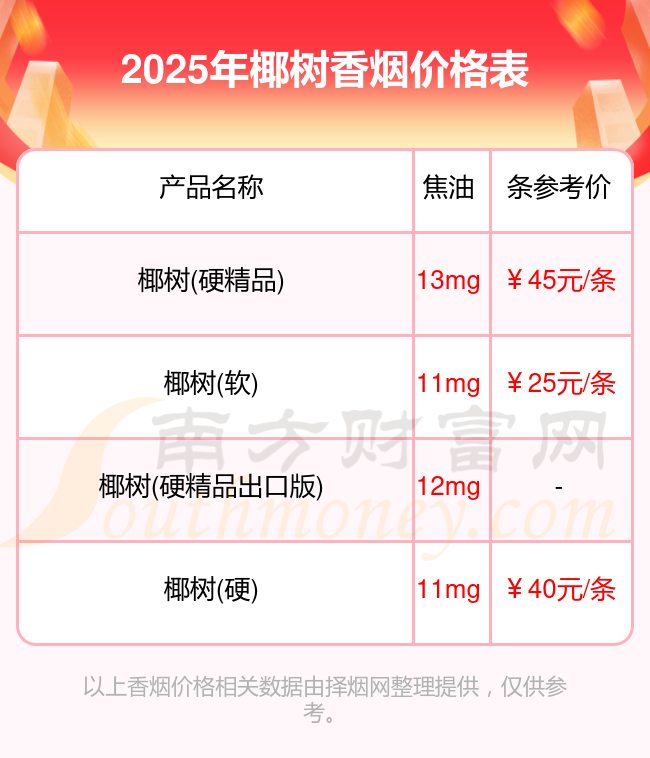 2025年,椰樹(硬精品)、椰樹(硬)、椰樹(軟)等椰樹香煙價(jià)格如下:椰樹(硬精品)參考價(jià)4.5元/包、椰樹(硬)參考價(jià)4.0元/包、椰樹(軟)參考價(jià)2.5元/包。