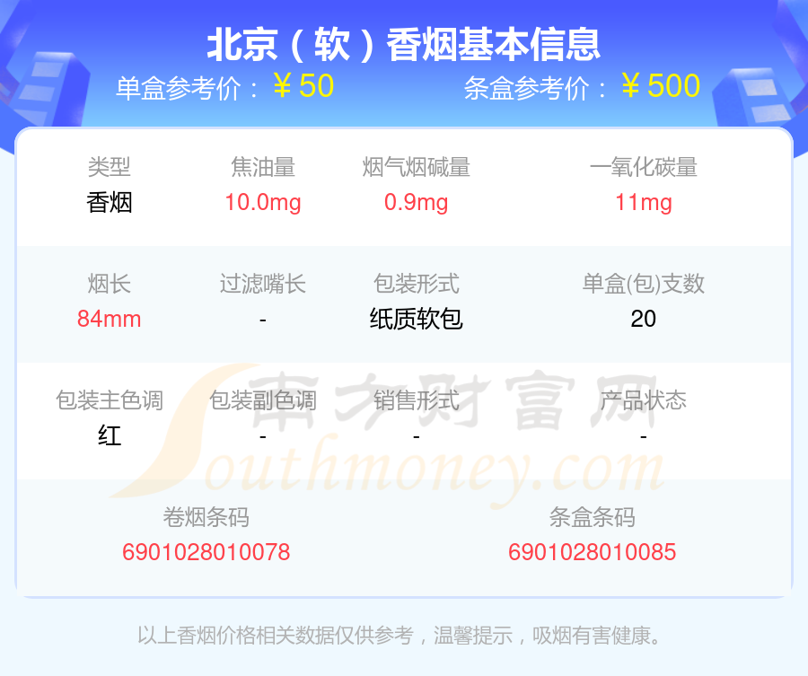 北京香煙50-90元的煙有北京(軟)、北京(紅)、北京(軟紅)等,具體價(jià)格如下: