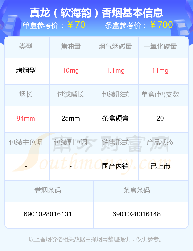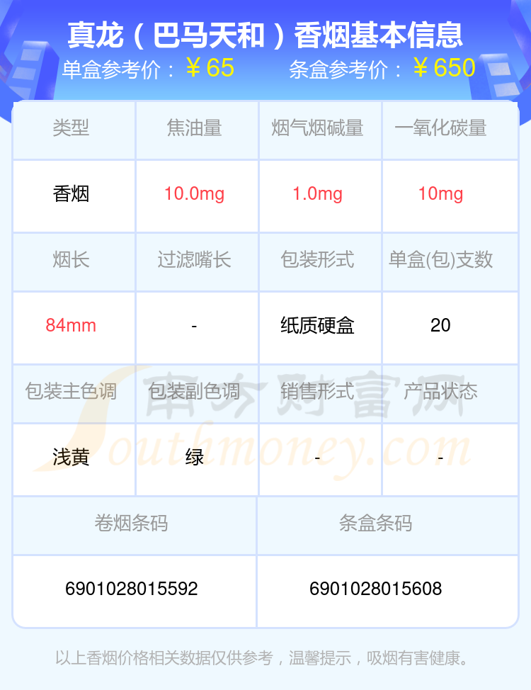 擇煙網(wǎng)為大家盤點了六十到七十元左右的真龍香煙,分別有真龍(軟海韻)參考價70元/包、真龍(巴馬天和)參考價65.0元/包、真龍(禪韻)參考價65元/包、真龍(海韻細支)參考價60.0元/包等。