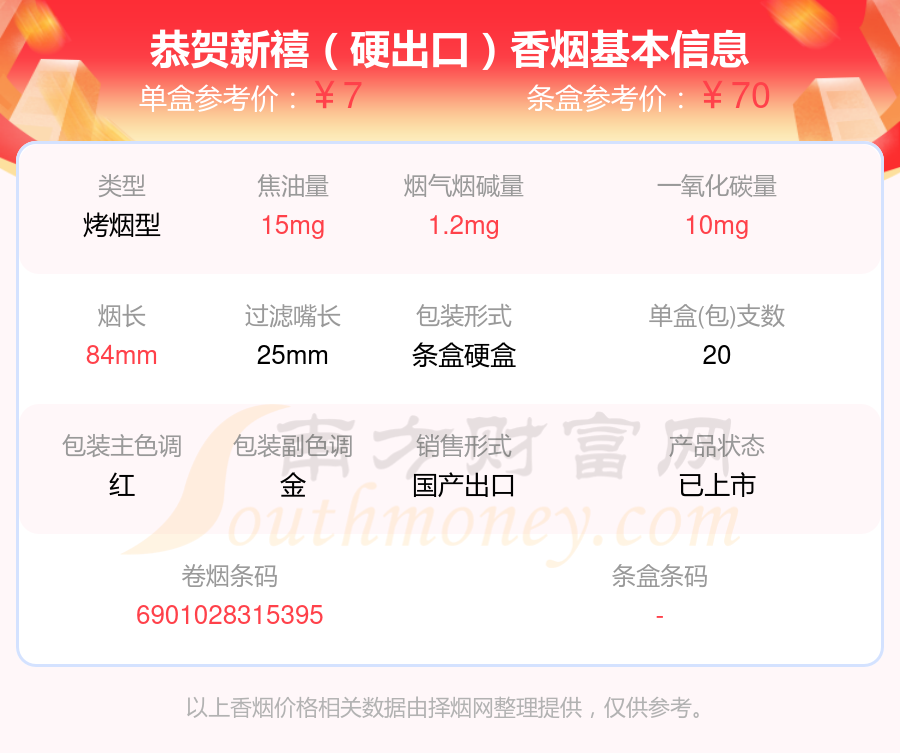 焦油量高于15mg的恭賀新禧香煙有哪些?擇煙網(wǎng)為大家整理盤點(diǎn),分別有:恭賀新禧(硬出口)、恭賀新禧(喜慶)等,具體價格如下: