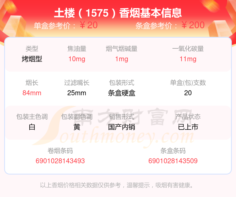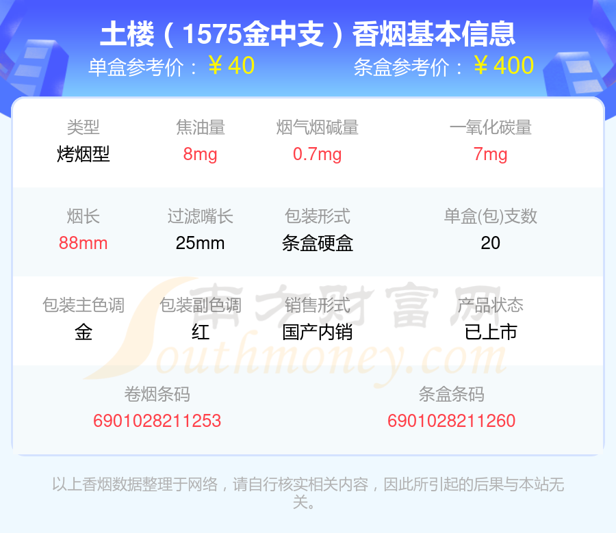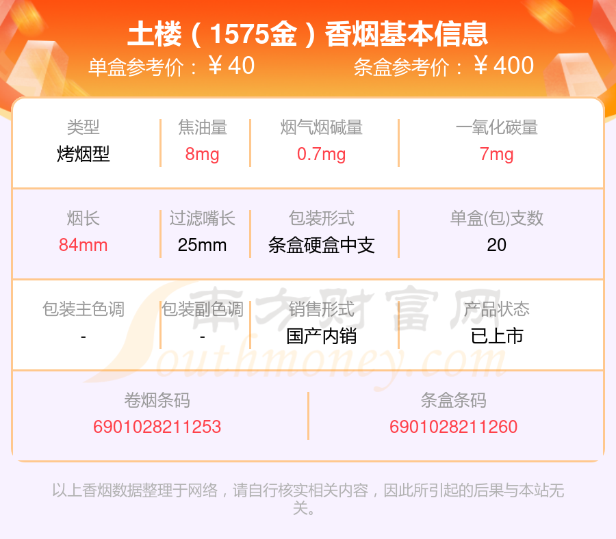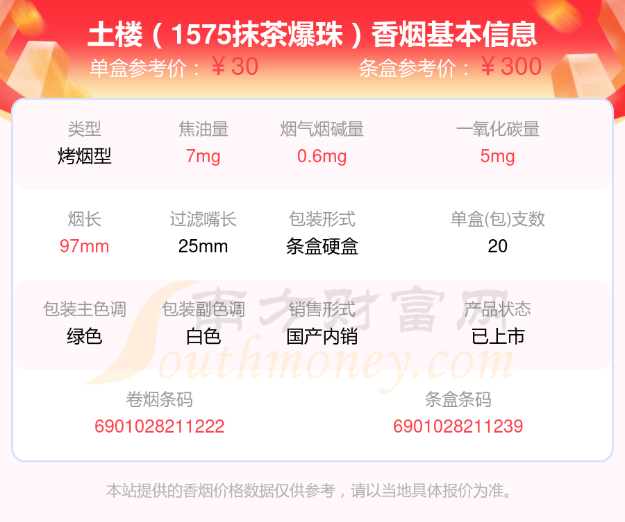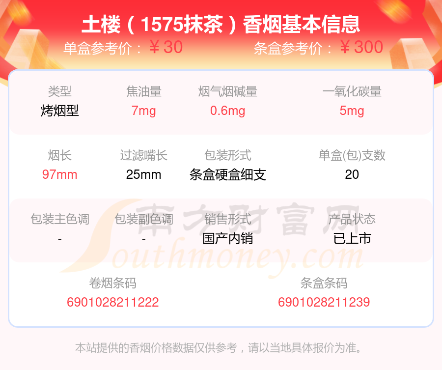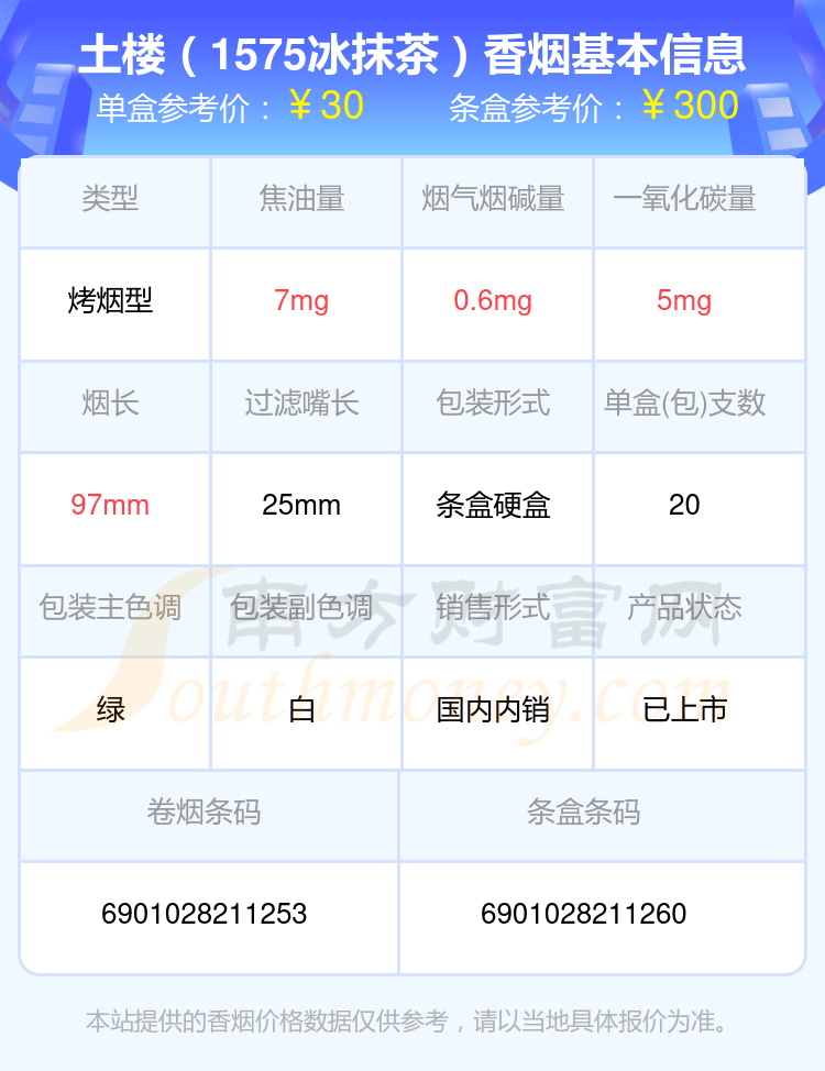 土樓(1575金)參考價(jià)40元/包、土樓(1575金中支)參考價(jià)40元/包、土樓(1575冰抹茶)參考價(jià)30元/包、土樓(1575抹茶)參考價(jià)30元/包、土樓(1575抹茶爆珠)參考價(jià)30元/包、土樓(神韻)參考價(jià)41.0元/包、土樓(1575)參考價(jià)20元/包等。